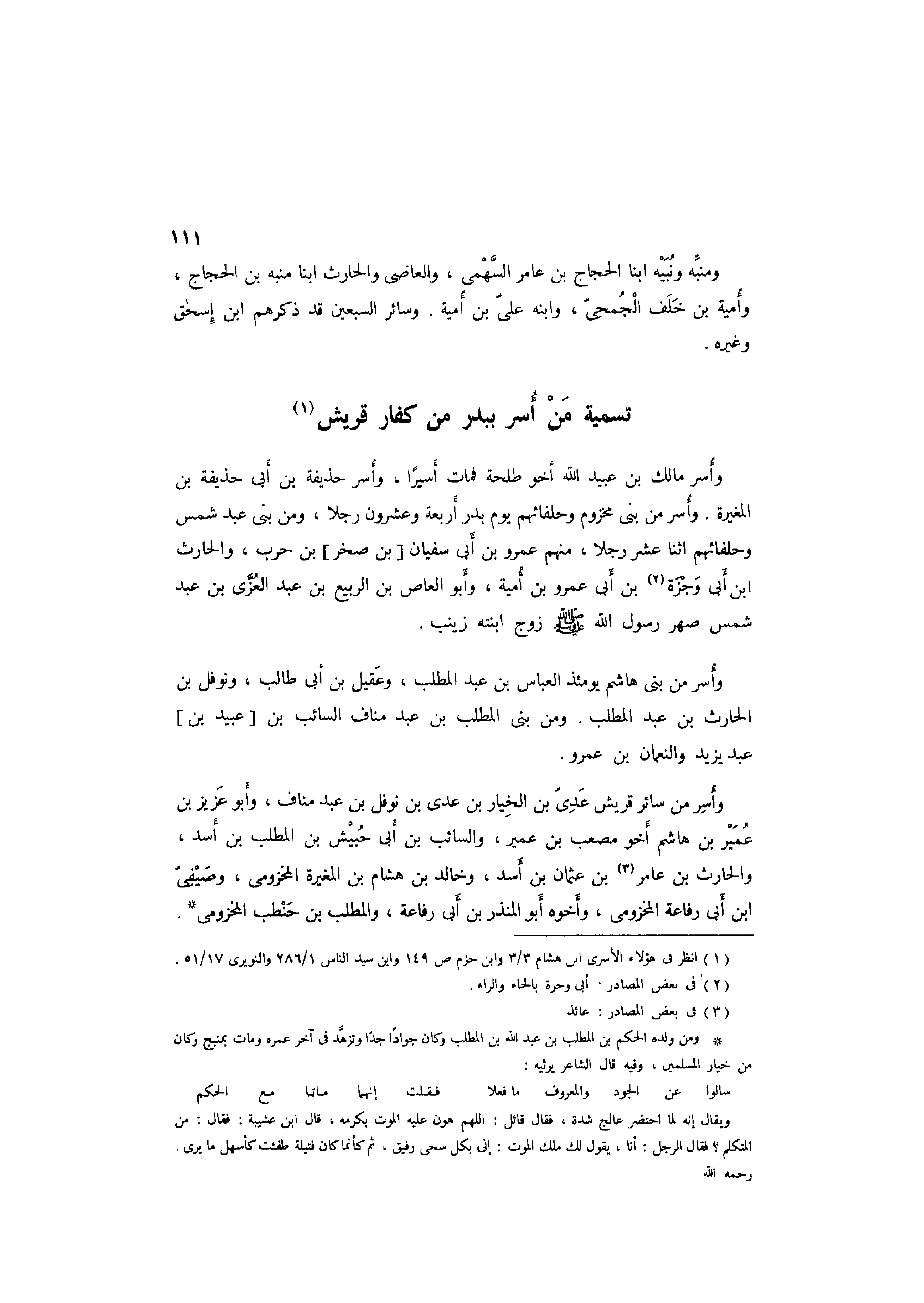 وَأسر مَالك بْن عبيد اللَّه أَخُو طَلْحَة فَمَاتَ أَسِيرًا، وَأسر حُذَيْفَة بْن أبي حُذَيْفَة بْن الْمُغيرَة. وَأسر من بني مَخْزُوم وحلفائهم يَوْم بدر أَرْبَعَة وَعِشْرُونَ رجلا، وَمن بني عَبْد شمس وحلفائهم اثْنَا عشر رجلا، مِنْهُم عَمْرو بْن أبي سُفْيَان [بْن صَخْر] بن حَرْب، والْحَارث ابْن أبي وجزة2 بْن أبي عَمْرو بْن أُميَّة، وَأَبُو الْعَاصِ بْن الرّبيع بْن عَبْد الْعُزَّى بْن عَبْد شمس صهر رَسُول اللَّه صَلَّى اللَّهُ عَلَيْهِ وَسَلَّمَ زوج ابْنَته زَيْنَب.