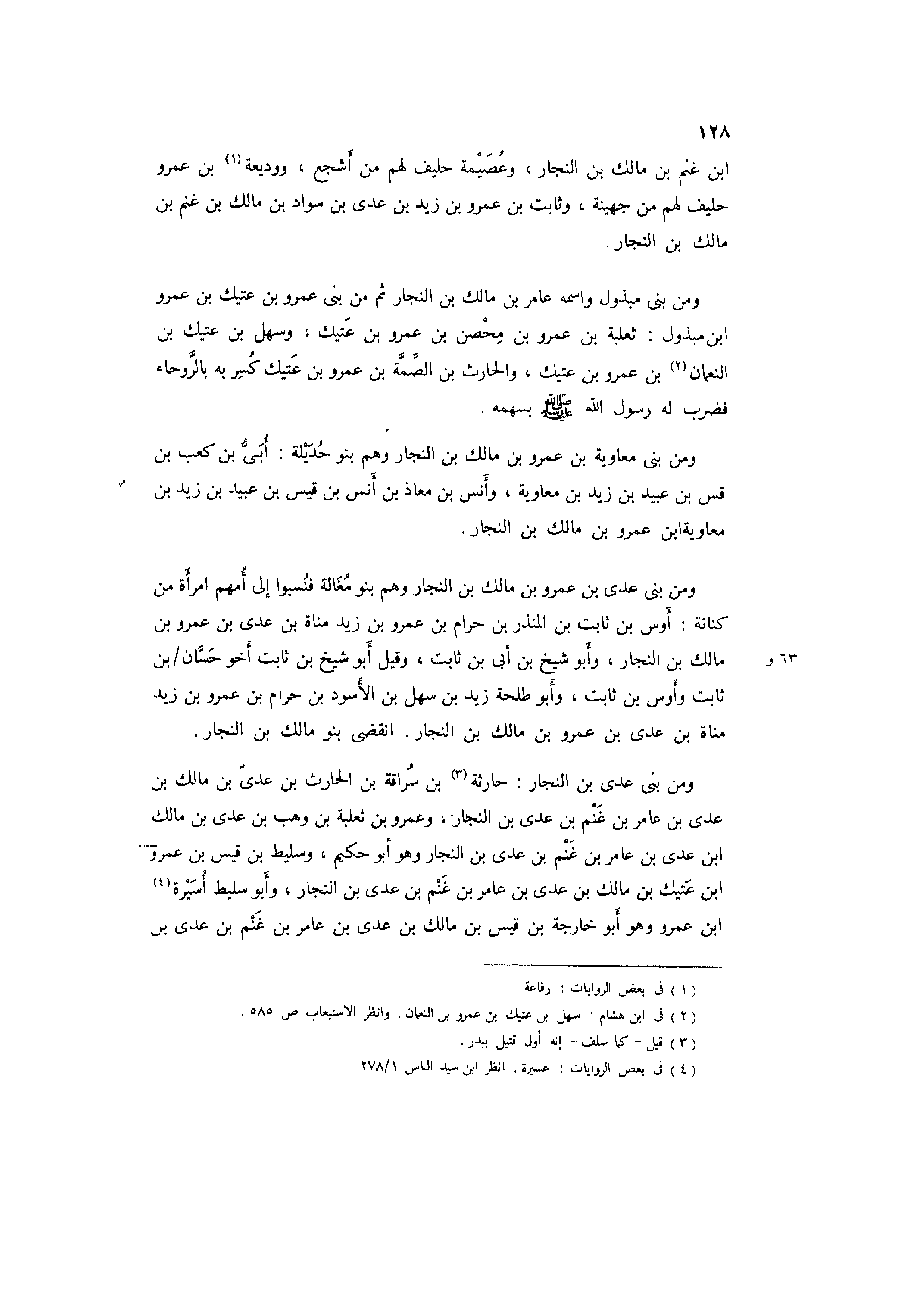 وَمن بني عدي بْن النجار: حَارِثَة3 بْن سراقَة بْن الْحَارِث بْن عدي بْن مَالك بْن عدي بْن عَامر بن غنم بْن عدي بْن النجار، وَعَمْرو بْن ثَعْلَبَة بْن وهب بْن عدي بْن مَالك بْن عدي بْن عَامر بن غنم بْن عدي بْن النجار وَهُوَ أَبُو حَكِيم، وسليط بْن قيس بْن عَمْرو بْن عتِيك بْن مَالك بْن عدي بْن عَامر بن غنم بْن عدي بْن النجار، وَأَبُو سليط أسيرة4 بن عَمْرو وَهُوَ أَبُو خَارِجَة بْن قيس بْن مَالك بْن عدي بْن عَامر بن غنم بْن عدي بن