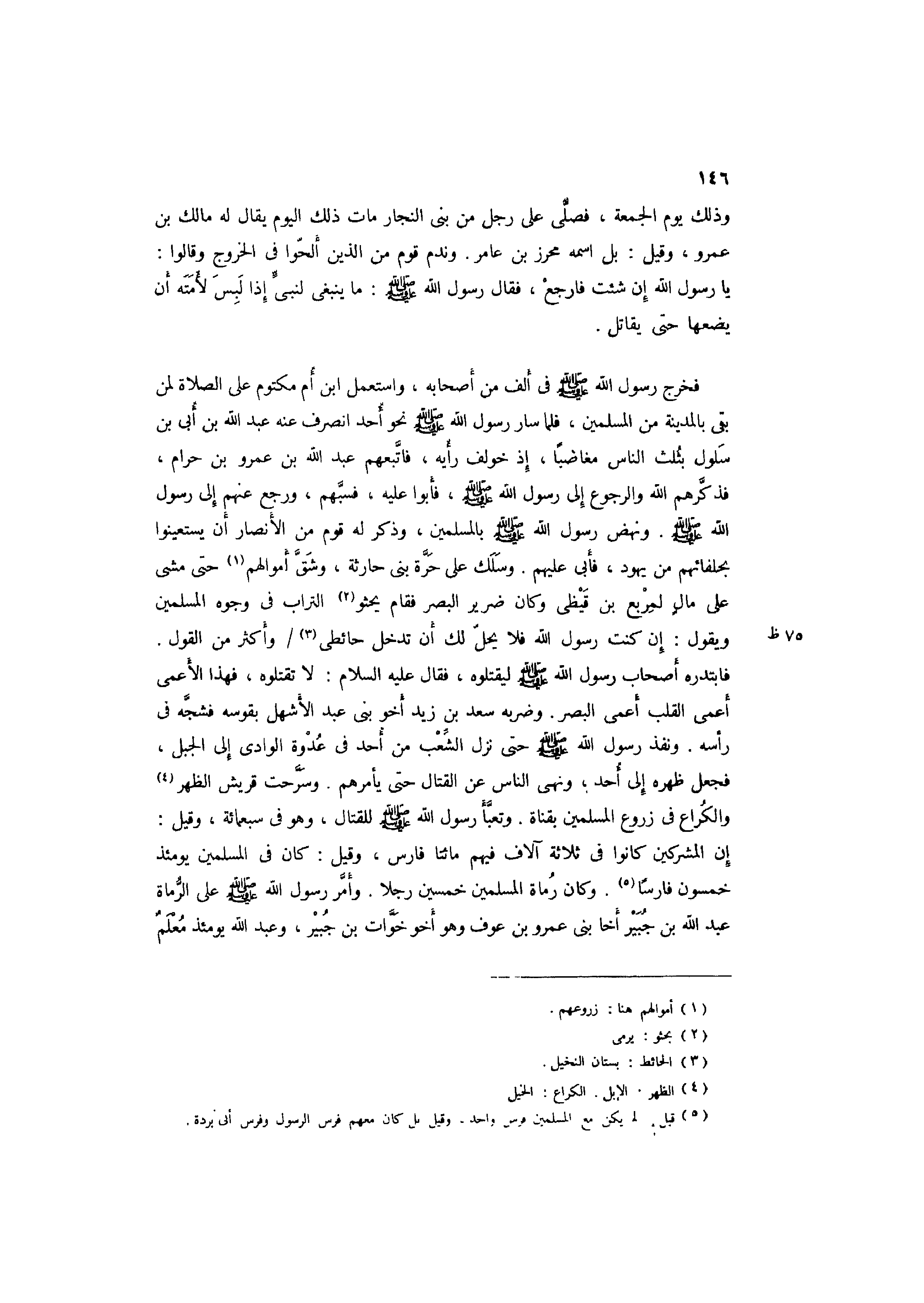فَخرج رَسُولُ اللَّهِ صَلَّى اللَّهُ عَلَيْهِ وَسَلَّمَ فِي ألف من أَصْحَابه، وَاسْتعْمل ابنَ أم مَكْتُوم على الصَّلَاة لمن بَقِي بِالْمَدِينَةِ من الْمُسلمين، فَلَمَّا سَار رَسُول اللَّه صَلَّى اللَّهُ عَلَيْهِ وَسَلَّمَ نَحْو أحد انْصَرف عَنهُ عَبْد اللَّهِ بْن أبي بْن سلول بِثلث النَّاس مغاضبا، إِذْ خُولِفَ رَأْيه، فاتبعهم عَبْد اللَّهِ بْن عَمْرو بْن حرَام، فَذَكَّرَهُمُ اللَّهَ والرجوعَ إِلَى رَسُول اللَّه صَلَّى اللَّهُ عَلَيْهِ وَسَلَّمَ، فَأَبَوا عَلَيْهِ، فسبهم، وَرجع عَنْهُم إِلَى رَسُول اللَّه صَلَّى اللَّهُ عَلَيْهِ وَسَلَّمَ. ونهض رَسُولُ اللَّهِ صَلَّى اللَّهُ عَلَيْهِ وَسَلَّمَ بِالْمُسْلِمين، وَذكر لَهُ قوم من الْأَنْصَار أَن يستعينوا بحلفائهم من يهود، فَأبى عَلَيْهِم. وسلك على حرَّة بن حَارِثَة، وشق أَمْوَالهم1 حَتَّى مَشى على مَال لمربع بْن قيظي وَكَانَ ضَرِير الْبَصَر فَقَامَ يحثو2 التُّرَاب فِي وُجُوه الْمُسلمين وَيَقُول: إِن كنتَ رَسُول اللَّه فَلَا يحل لَك أَن تدخل حائطي3 وَأكْثر من القَوْل. فَابْتَدَرَهُ أَصْحَاب رَسُولُ اللَّهِ صَلَّى اللَّهُ عَلَيْهِ وَسَلَّمَ ليقتلوه، فَقَالَ عَلَيْهِ السَّلَام: "فَهَذَا الْأَعْمَى أعمى الْقلب أعمى الْبَصَر". وضربه سعد بْن زيد أَخُو بني عَبْد الْأَشْهَل بقوسه فَشَجَّهُ فِي رَأسه. وَنفذ رَسُول اللَّهِ صَلَّى اللَّهُ عَلَيْهِ وَسَلَّمَ حَتَّى نزل الشّعب من أحد فِي عدوة الْوَادي إِلَى الْجَبَل، فَجعل ظَهره إِلَى أحد، وَنهى النَّاس عَن الْقِتَال حَتَّى يَأْمُرهُم. وسرحت قُرَيْش الظّهْر4 والكراع فِي زروع الْمُسلمين بقناة. وتعبأ رَسُول اللَّهِ صَلَّى اللَّهُ عَلَيْهِ وَسَلَّمَ لِلْقِتَالِ، وَهُوَ فِي سَبْعمِائة، وَقيل: إِن الْمُشْركين كَانُوا ثَلَاثَة آلَاف فيهم مِائَتَا فَارس، وَقيل: كَانَ فِي الْمُسلمين يَوْمئِذٍ خَمْسُونَ فَارِسًا5. وَكَانَ رُمَاة الْمُسلمين خمسين رجلا. وَأَمَّرَ رَسُول اللَّه صَلَّى اللَّهُ عَلَيْهِ وَسَلَّمَ على الرُّمَاة عبد الله بن جبر أَخا بني عَمْرو بْن عَوْف وَهُوَ أَخُو خَوات بْن جُبَير، وَعبد الله يَوْمئِذٍ معلم