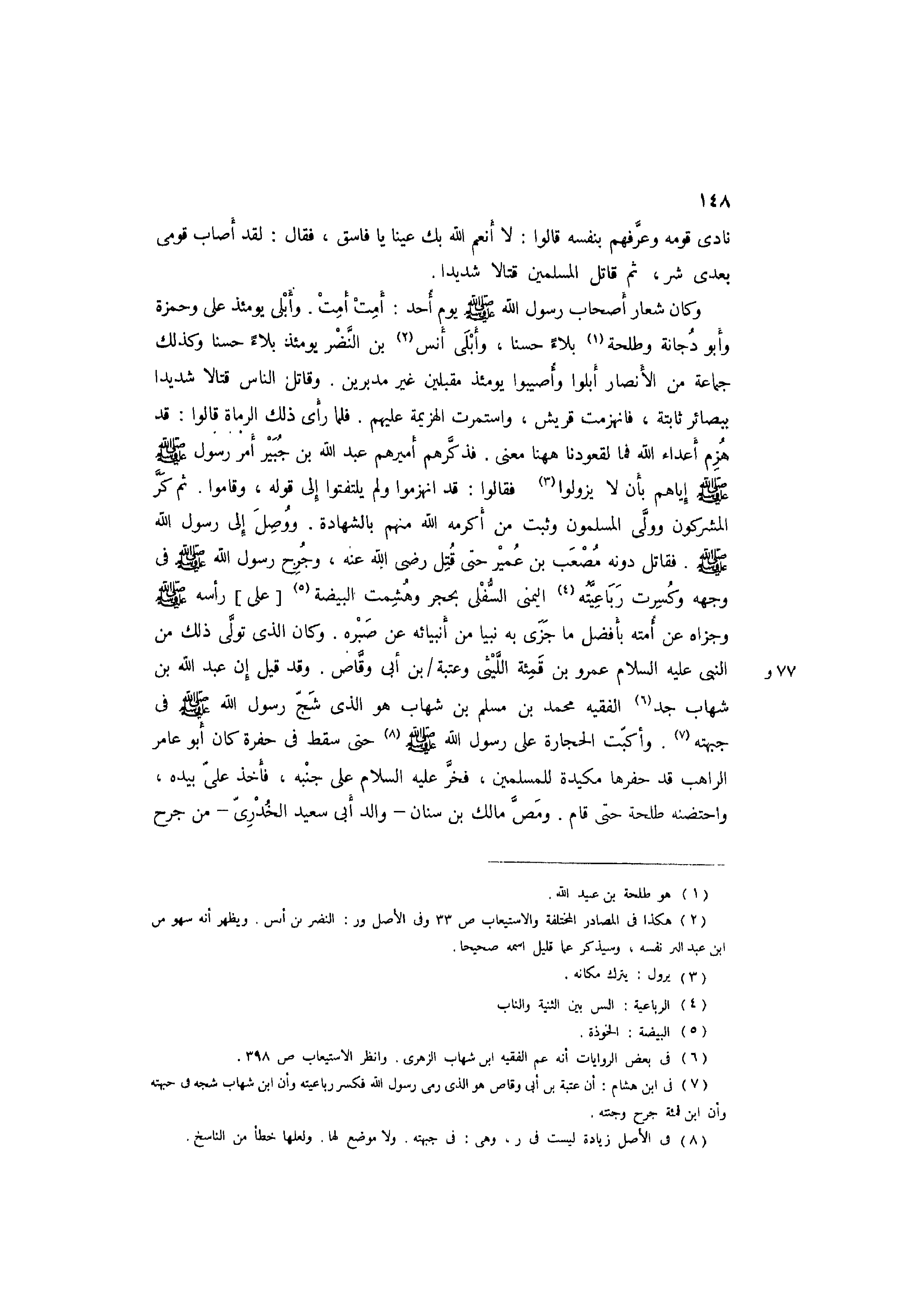 7 فِي ابْن هِشَام: أَن عتبَة بن أبي وَقاص هُوَ الَّذِي رمى رَسُول الله فَكسر رباعيته وَأَن ابْن شهَاب شجه فِي جَبهته وَأَن ابْن قمئة جرح وجنته.