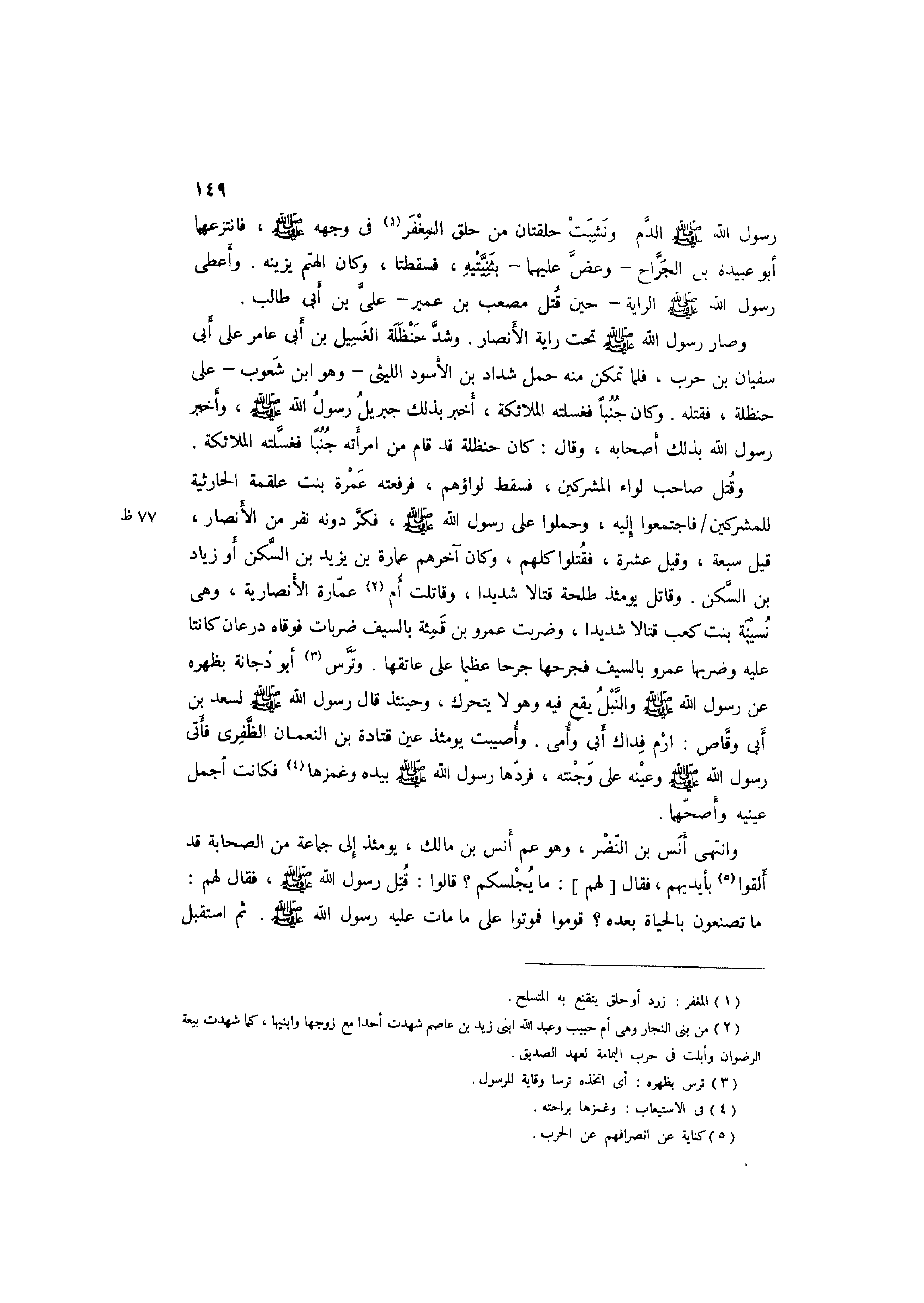 رَسُولُ اللَّهِ صَلَّى اللَّهُ عَلَيْهِ وَسَلَّمَ الدَّم. ونشبت حلقتان من حلق المعفر1 فِي وَجهه صَلَّى اللَّهُ عَلَيْهِ وَسَلَّمَ، فانتزعهما أَبُو عُبَيْدَة بْن الْجراح وعض عَلَيْهِمَا بثنيتيه، فسقطتا، وَكَانَ الهتم يزينه. وَأعْطى رَسُول اللَّهِ صَلَّى اللَّهُ عَلَيْهِ وَسَلَّمَ الرَّايَة -حِين قتل مصعبُ بْن عُمَيْر- عَلِيَّ بْنَ أبي طَالب.