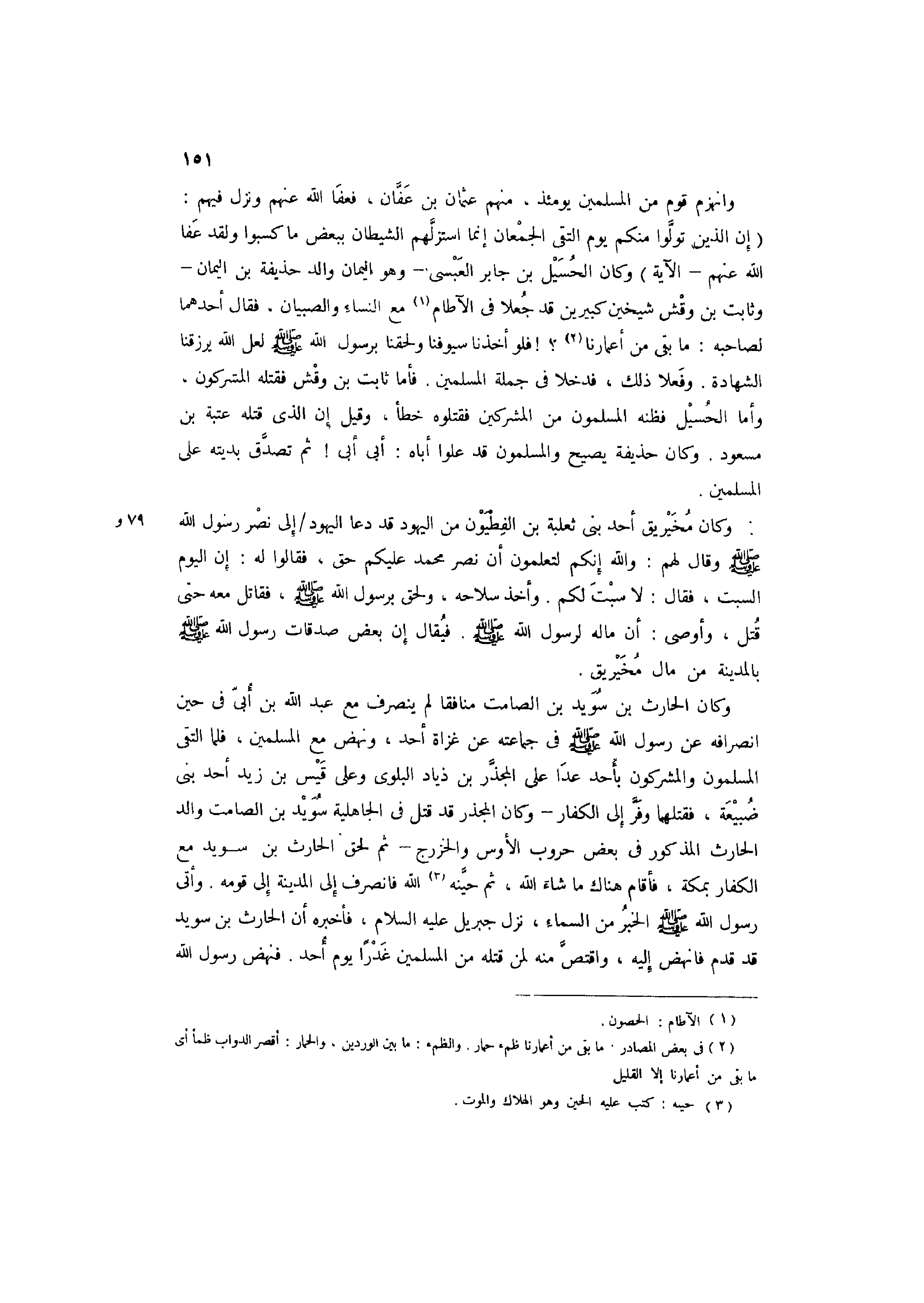 وَانْهَزَمَ قوم من الْمُسلمين يَوْمئِذٍ، مِنْهُم عُثْمَان بْن عَفَّان، فَعَفَا اللَّه عَنْهُم وَنزل فيهم: {إِنَّ الَّذِينَ تَوَلَّوْا مِنْكُمْ يَوْمَ الْتَقَى الْجَمْعَانِ إِنَّمَا اسْتَزَلَّهُمُ الشَّيْطَانُ بِبَعْضِ مَا كَسَبُوا وَلَقَدْ عَفَا اللَّهُ عَنْهُم ... } الْآيَة وَكَانَ الحسيل بْن جَابر الْعَبْسِي -وَهُوَ الْيَمَان وَالِد حُذَيْفَة بْن الْيَمَان- وثابت بْن وقش شيخين كبيرين قد جُعِلا فِي الْآطَام1 مَعَ النِّسَاء وَالصبيان، فَقَالَ أَحدهمَا لصَاحبه: مَا بَقِي من أعمارنا2؟! فَلَو أَخذنَا سُيُوفنَا ولحقنا برَسُول اللَّه صَلَّى اللَّهُ عَلَيْهِ وَسَلَّمَ لَعَلَّ اللَّه يرزقنا الشَّهَادَة. وَفَعَلا ذَلِك، فدخلا فِي جملَة الْمُسلمين. فَأَما ثَابت بْن وقش فَقتله الْمُشْركُونَ، وَأما الحسيل فَظَنهُ الْمُسلمُونَ من الْمُشْركين فَقَتَلُوهُ خطأ، وَقيل إِن الَّذِي قَتله عتبَة بْن مَسْعُود. وَكَانَ حُذَيْفَة يَصِيح والمسلمون قد علوا أَبَاهُ: أَبِي أَبِي! ثمَّ تصدق بديته على الْمُسلمين.