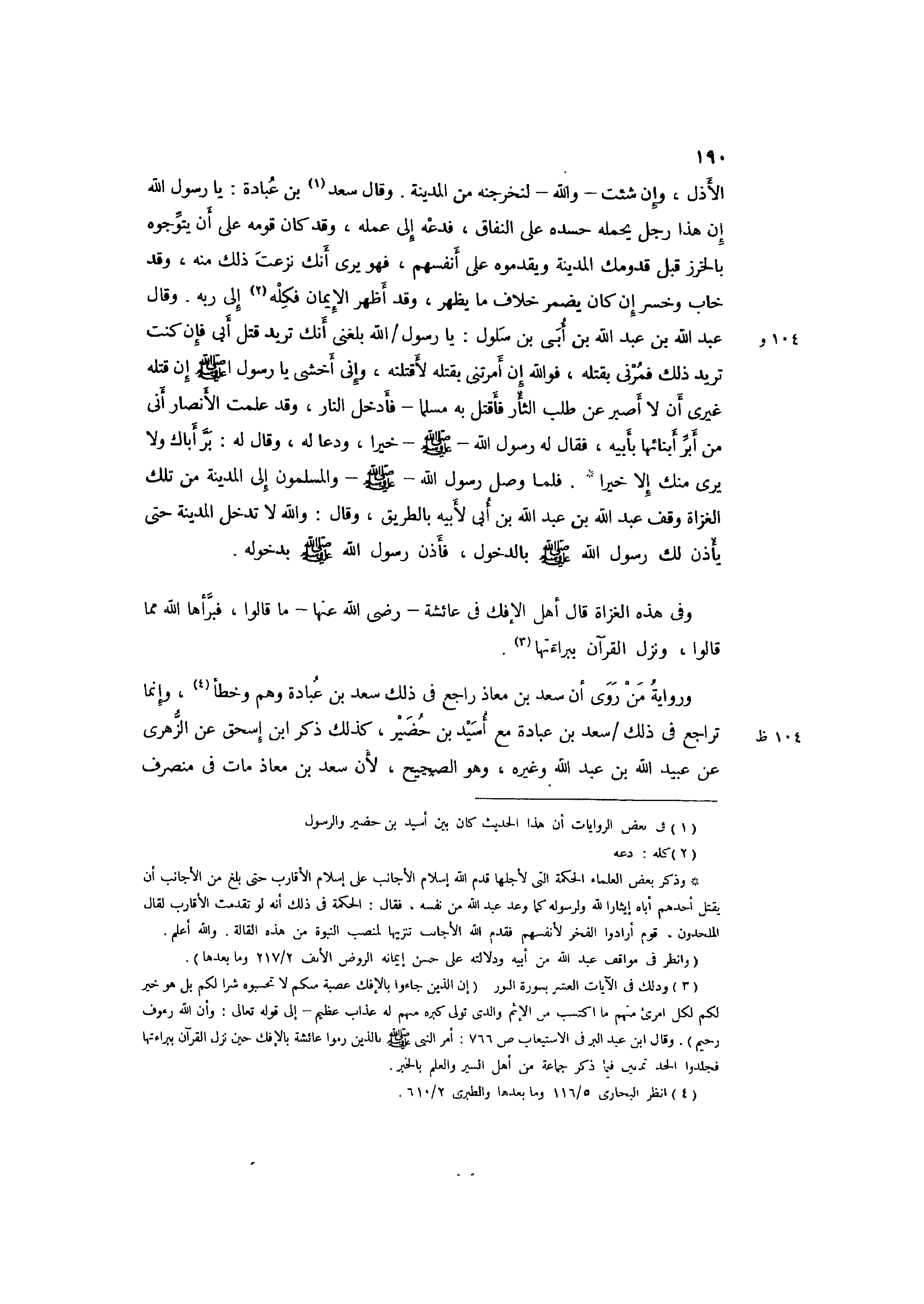 الْأَذَل، وَإِن شِئْت -وَالله- لنخرجنه من الْمَدِينَة. وَقَالَ سعد1 بْن عبَادَة: يَا رَسُول اللَّه إِن هَذَا رجل يحملهُ حسده على النِّفَاق، فَدَعْهُ إِلَى عمله، وَقد كَانَ قومه على أَن يُتَوِّجُوهُ بالخرز قبل قدومك الْمَدِينَة ويقدموه على أنفسهم، فَهُوَ يرى أَنَّك نزعت ذَلِك مِنْهُ، وَقد خَابَ وخسر إِن كَانَ يضمر خلاف مَا يظْهر، وَقد أظهر الْإِيمَان فَكِلْهُ2 إِلَى ربه. وَقَالَ عَبْد اللَّهِ بْن عَبْد اللَّهِ بْن أبي بْن سلول: يَا رَسُول اللَّه بَلغنِي أَنَّك تُرِيدُ قتل أبي فَإِن كنت تُرِيدُ ذَلِك فمرني بقتْله، فوَاللَّه إِن أَمرتنِي بقتْله لأقتلنه، وَإِنِّي أخْشَى يَا رَسُولُ اللَّهِ صَلَّى اللَّهُ عَلَيْهِ وَسلم إِن قَتله غَيْرِي أَن لَا أَصْبِر عَن طلب الثأر فأقتلَ بِهِ مُسلما فأدخلَ النَّار، وَقد علمت الْأَنْصَار أَنِّي من أبر أبنائها بِأَبِيهِ، فَقَالَ لَهُ رَسُول اللَّه صَلَّى اللَّهُ عَلَيْهِ وَسَلَّمَ خيرا، ودعا لَهُ، وَقَالَ لَهُ: "بر أَبَاك وَلَا يرى مِنْك إِلَّا خيرا" *. فَلَمَّا وصل رَسُول اللَّه صَلَّى اللَّهُ عَلَيْهِ وَسَلَّمَ والمسلمون إِلَى الْمَدِينَة من تِلْكَ الْغُزَاة وقف عَبْد اللَّهِ بْن عَبْد اللَّهِ بْن أبي لِأَبِيهِ بِالطَّرِيقِ، وَقَالَ: وَالله لَا تدخل الْمَدِينَة حَتَّى يَأْذَن لَك رَسُول اللَّه صَلَّى اللَّهُ عَلَيْهِ وَسَلَّمَ بِالدُّخُولِ، فَأذن رَسُول اللَّه صَلَّى اللَّهُ عَلَيْهِ وَسَلَّمَ بِدُخُولِهِ.
