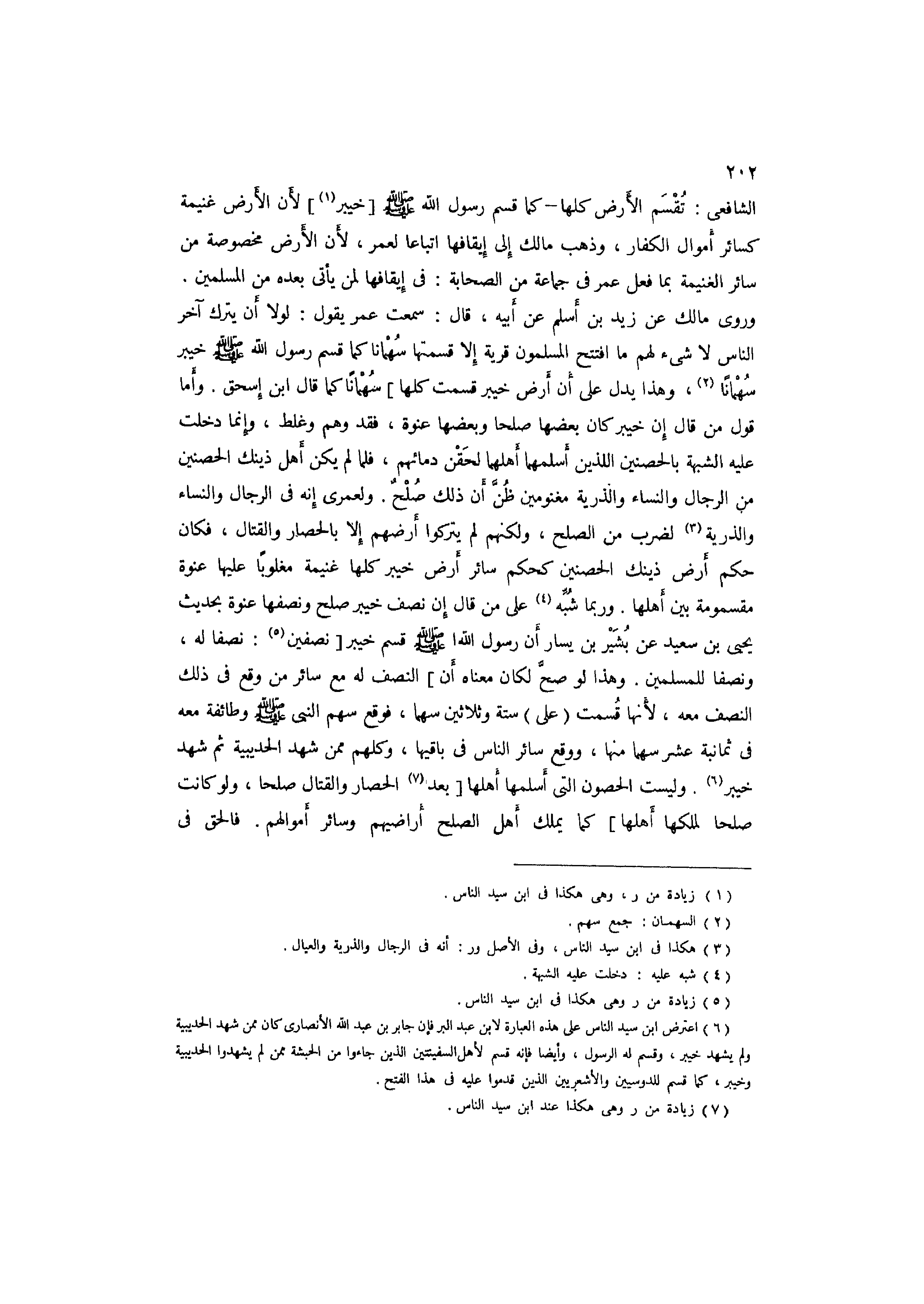 وَقَالَ الشَّافِعِيُّ: تقسم الأَرْض كلهَا كَمَا قسم رَسُول اللَّه صَلَّى اللَّهُ عَلَيْهِ وَسَلَّمَ [خَيْبَر1] لِأَن الأَرْض غنيمَة كَسَائِر أَمْوَال الْكفَّار، وَذهب مَالك إِلَى إيقافها اتبَاعا لعمر، لِأَن الأَرْض مَخْصُوصَة من سَائِر الْغَنِيمَة بِمَا فعل عمر فِي جمَاعَة من الصَّحَابَة: فِي إيقافها لمن يَأْتِي بعده من الْمُسلمين. وَرَوَى مَالِكٌ عَنْ زَيْدِ بْنِ أَسْلَمَ عَنْ أَبِيهِ، قَالَ: سَمِعْتُ عُمَرَ يَقُولُ: لَوْلا أَنْ يُتْرَكَ آخِرُ النَّاسِ لَا شَيْءَ لَهُمْ مَا افْتَتَحَ الْمُسْلِمُونَ قَرْيَةً إِلَّا قسمته سُهْمَانًا كَمَا قَسَمَ رَسُولُ اللَّهِ صَلَّى اللَّهُ عَلَيْهِ وَسَلَّمَ خَيْبَر سُهْمَانًا2، وَهَذَا يدل على أَن أَرض خَيْبَر قسمت كلهَا سهمانا كَمَا قَالَ ابْن إِسْحَاق. وَأما قَول من قَالَ إِن خَيْبَر كَانَ بَعْضهَا صلحا وَبَعضهَا عنْوَة، فقد وهم وَغلط، وَإِنَّمَا دخلت عَلَيْهِ الشُّبْهَة بالحصنين اللَّذين أسلمهما أهلهما لحقن دِمَائِهِمْ. فَلَمَّا لم يكن أهل ذَيْنك الحصنين من الرِّجَال وَالنِّسَاء والذرية3 لضرب من الصُّلْح، وَلَكنهُمْ لم يتْركُوا أَرضهم إِلَّا بالحصار والقتال، فَكَانَ حكم أَرض ذَيْنك الحصنين كَحكم سَائِر أَرض خَيْبَر كلهَا غنيمَة مَغْلُوبًا عَلَيْهَا عنْوَة مقسومة بَين أَهلهَا. وَرُبمَا شبه4 على من قَالَ: إِن نصف خَيْبَر صلح وَنِصْفهَا عنْوَة بِحَدِيثِ يَحْيَى بْنِ سَعِيدٍ عَنْ بَشِيرِ بْنِ يَسَارٍ أَنّ رَسُولُ اللَّهِ صَلَّى اللَّهُ عَلَيْهِ وَسَلَّمَ قَسَمَ خَيْبَرَ [نِصْفَيْنِ5: نِصْفًا لَهُ، وَنِصْفًا لِلْمُسْلِمِينَ. وَهَذَا لَوْ صَحَّ لَكَانَ مَعْنَاهُ أَنَّ] النِّصْفَ لَهُ مَعَ سَائِرِ مَنْ وَقَعَ فِي ذَلِكَ النِّصْفِ مَعَهُ، لأَنَّهَا قُسِمَتْ عَلَى سِتَّةٍ وَثَلاثِينَ سَهْمًا، فَوَقَعَ سَهْمُ النَّبِيِّ صَلَّى اللَّهُ عَلَيْهِ وَسَلَّمَ وَطَائِفَةٍ مَعَهُ فِي ثَمَانِيَةَ عَشَرَ سَهْمًا مِنْهَا، وَوقع سَائِر النَّاس فِي بَاقِيهَا، وَكلهمْ مِمَّن شهد الْحُدَيْبِيَة ثمَّ شهد خَيْبَر6. وَلَيْسَت الْحُصُون الَّتِي أسلمها أَهلهَا [بعد7 الْحصار والقتال صلحا، وَلَو كَانَت صلحا لملكها أَهلهَا] كَمَا يملك أهل الصُّلْح أراضيهم وَسَائِر أَمْوَالهم. فَالْحق فِي