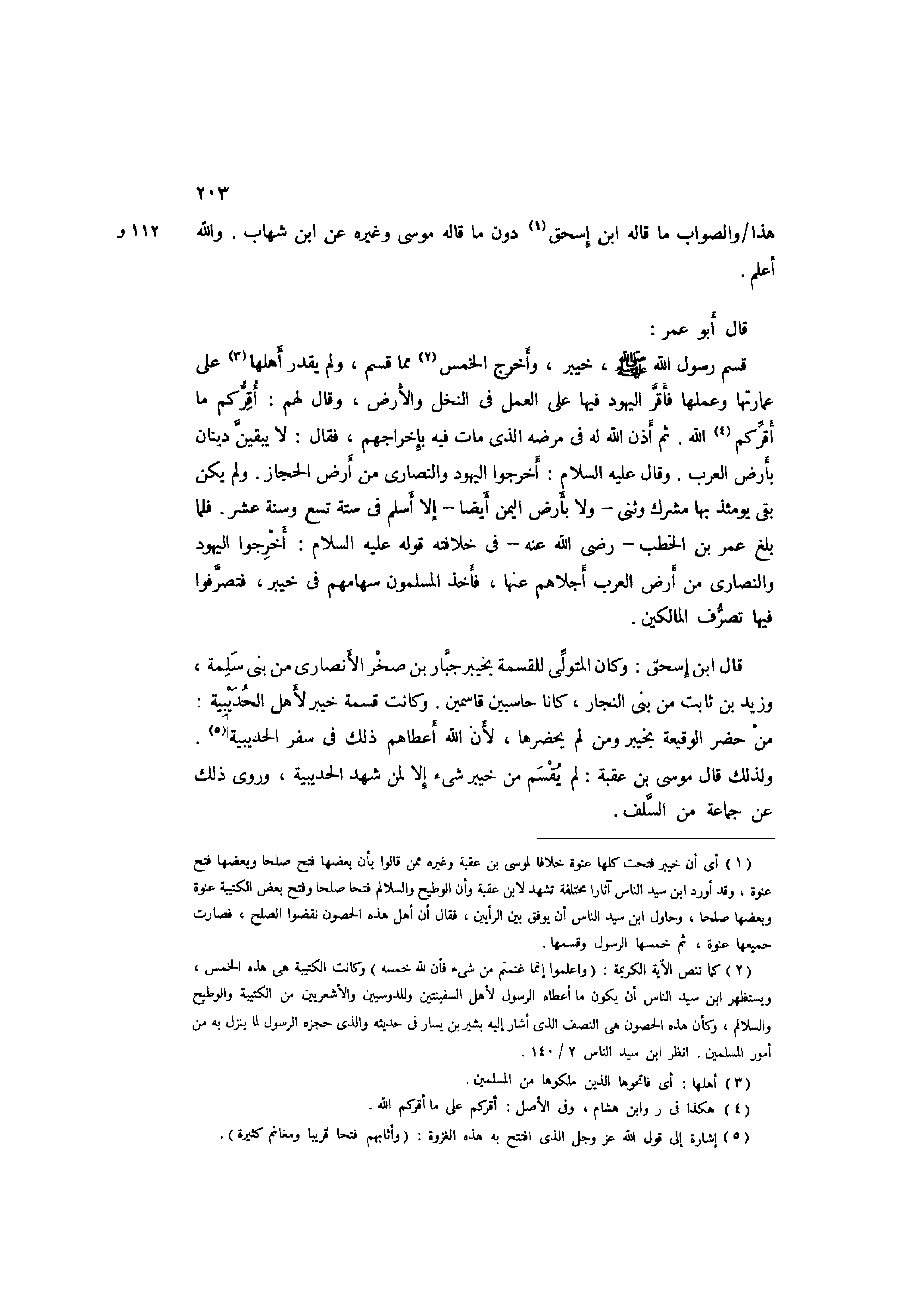 1 أَي أَن خَيْبَر فتحت كلهَا عنْوَة خلافًا لمُوسَى بن عقبَة وَغَيره مِمَّن قَالُوا بِأَن بَعْضهَا فتح صلحا وَبَعضهَا فتح عنْوَة، وَقد أورد ابْن سيد النَّاس آثارا مُخْتَلفَة تشهد لِابْنِ عقبَة وَأَن الوطيح والسلالم فتحا صلحا وَفتح بعض الكتيبة عنْوَة وَبَعضهَا صلحا، وحاول ابْن سيد النَّاس أَن يوفق بَين الرأيين، فَقَالَ أَن أهل هَذِه الْحُصُون نقضوا الصُّلْح، فَصَارَت جَمِيعهَا عنْوَة، ثمَّ خمسها الرَّسُول وَقسمهَا.