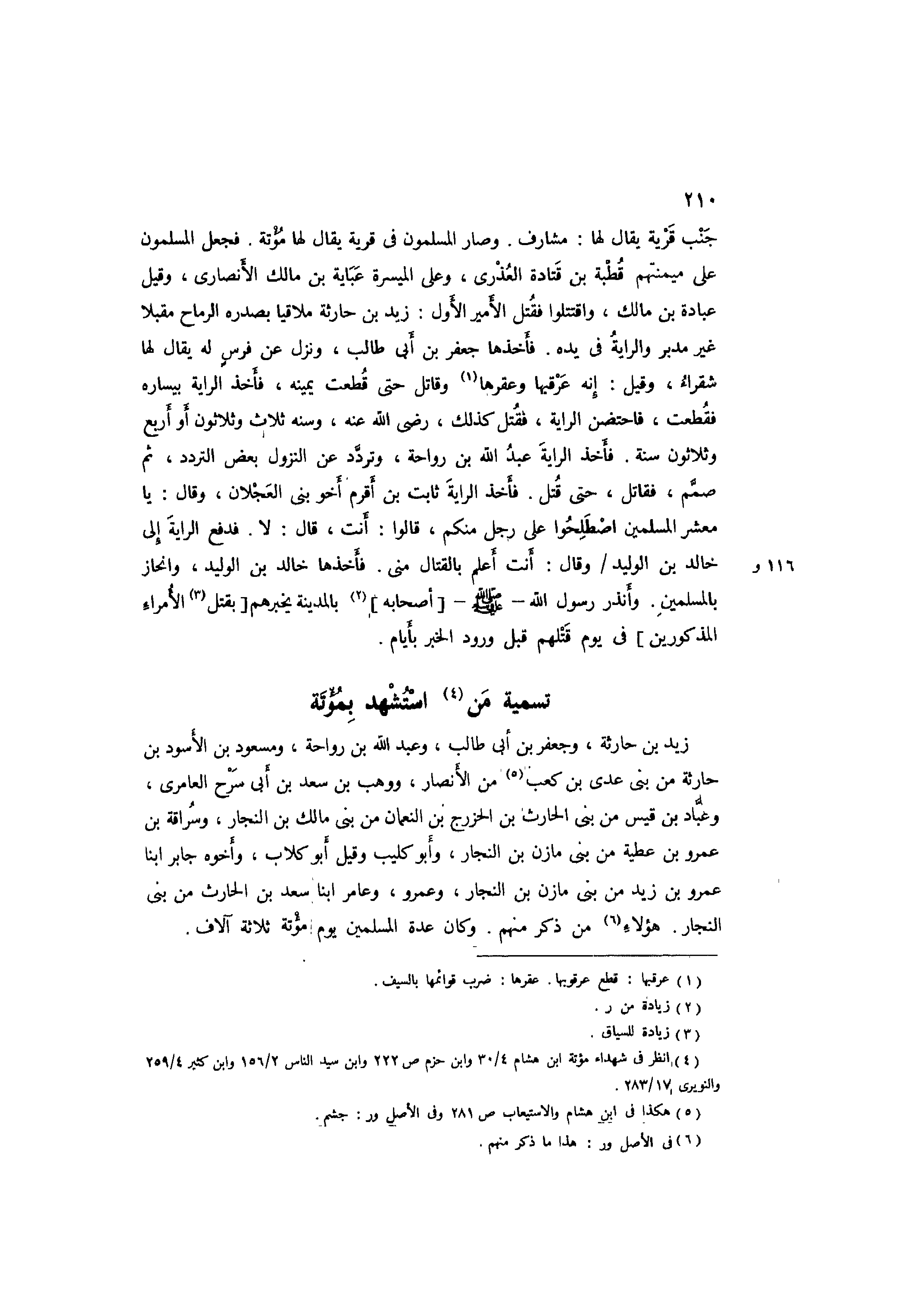 4 انْظُر فِي شُهَدَاء مُؤْتَة ابْن هِشَام 4/ 30 وَابْن حزم ص222 وَابْن سيد النَّاس 2/ 156 وَابْن كثير 4/ 259. والنويري 17/ 283.