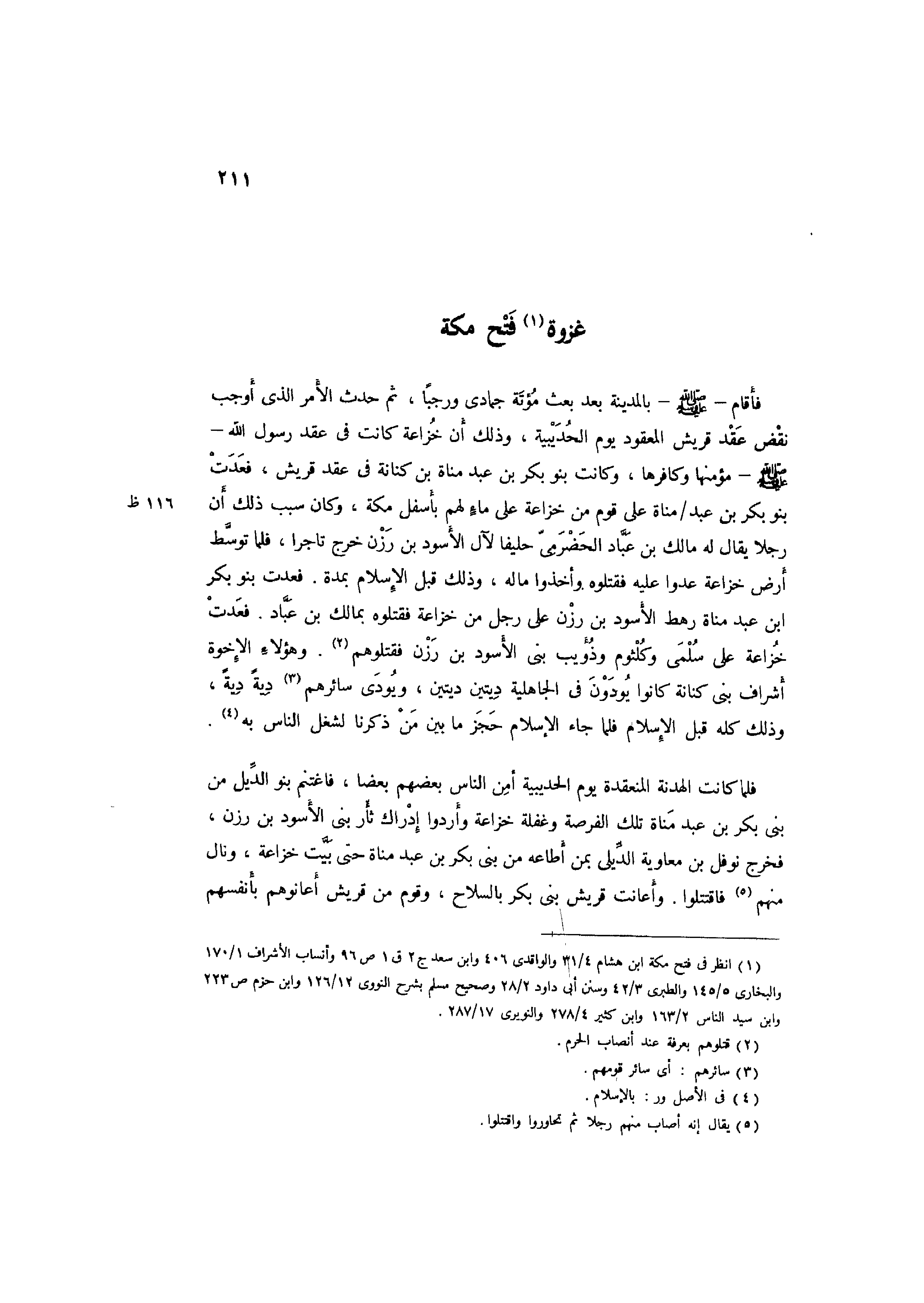 1 انْظُر فِي فتح مَكَّة ابْن هِشَام 4/ 31 والواقدي 406 وَابْن سعد ج2 ق1 ص96 وأنساب الْأَشْرَاف 1/ 170 وَالْبُخَارِيّ 5/ 145 والطبري 3/ 42 وَسنَن أبي دَاوُد 2/ 28 وصحيح مُسلم بشرح النَّوَوِيّ 12/ 126 وَابْن حزم ص223 وَابْن سيد النَّاس 2/ 163 وَابْن كثير 4/ 278 والنويري 17/ 287.