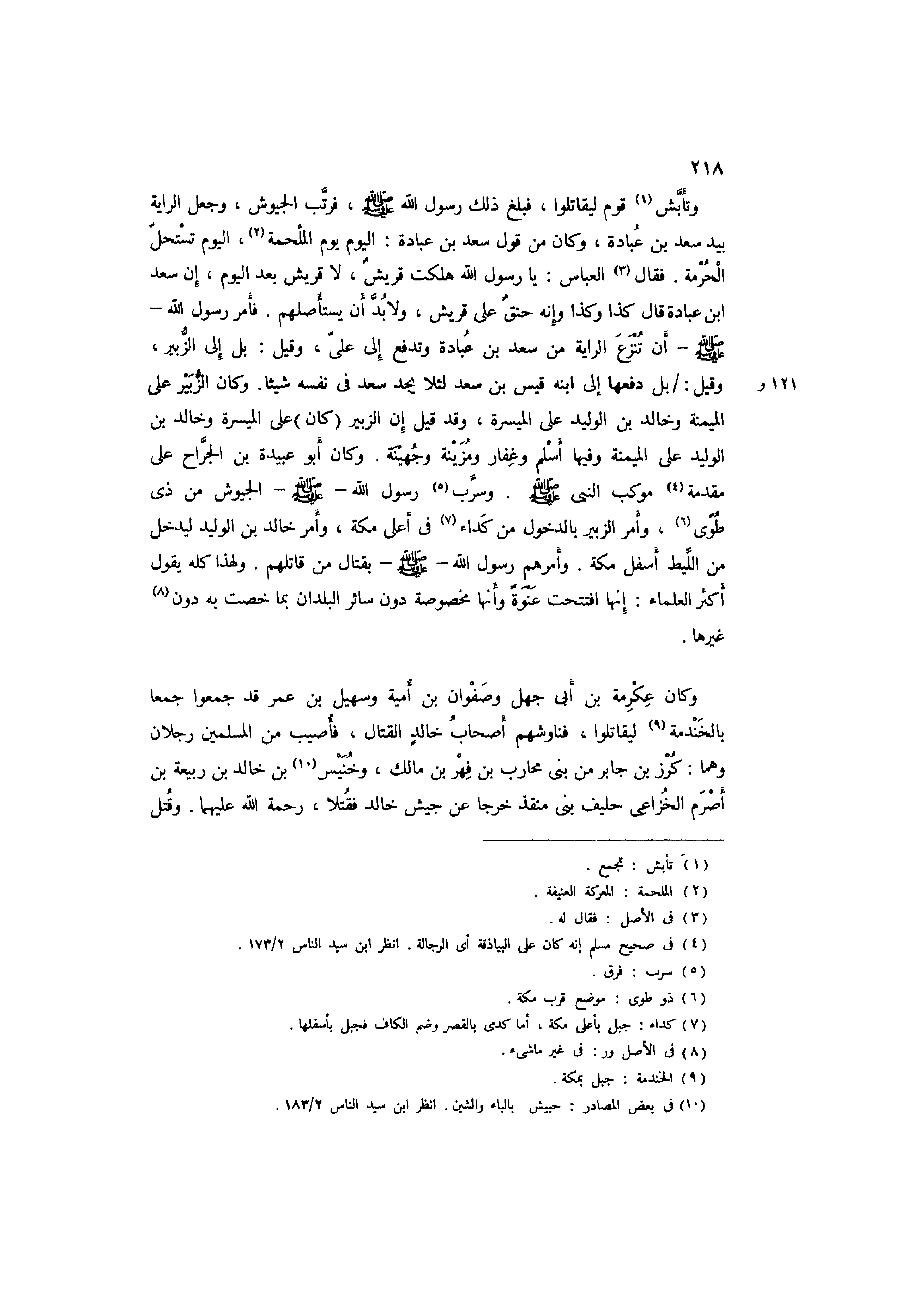 وَتَأَبَّشَ1 قوم لِيُقَاتِلُوا، فَبلغ ذَلِك رَسُولُ اللَّهِ صَلَّى اللَّهُ عَلَيْهِ وَسَلَّمَ، فرتب الجيوش، وَجعل الرَّايَة بيد سعد بْن عبَادَة، وَكَانَ من قَول سعد بْن عبَادَة: الْيَوْم يَوْم الملحمة2، الْيَوْم تستحل الْحُرْمَة. فَقَالَ الْعَبَّاس3: يَا رَسُول اللَّه هَلَكت قُرَيْش، لَا قُرَيْش بعد الْيَوْم، إِن سعد بْن عبَادَة قَالَ كَذَا وَكَذَا وَإنَّهُ حنق على قُرَيْش، وَلَا بُد أَن يَسْتَأْصِلهُمْ. فَأمر رَسُول اللَّه صَلَّى اللَّهُ عَلَيْهِ وَسَلَّمَ إِنَّ تنْزع الرَّايَة من سعد بْن عبَادَة وتدفع إِلَى عَليّ، وَقيل: بل إِلَى الزبير، وَقيل: بل دفها إِلَى ابْنه قيس بْن سعد لِئَلَّا يجد سعد فِي نَفسه شَيْئا. وَكَانَ الزبير على الميمنة وخَالِد بْن الْوَلِيد على الميسرة، وَقد قيل إِن الزبير كَانَ على الميسرة وخَالِد بْن الْوَلِيد على الميمنة وفيهَا أَسْلَمُ وغفار وَمُزَيْنَة وجهينة. وَكَانَ أَبُو عُبَيْدَة بْن الْجراح على مُقَدّمَة4 موكب النَّبِي صَلَّى اللَّهُ عَلَيْهِ وَسَلَّمَ. وسرب5 رَسُول اللَّه صَلَّى اللَّهُ عَلَيْهِ وَسَلَّمَ الجيوش من ذِي طوى6، وَأمر الزبير بِالدُّخُولِ من كداء7 فِي أَعلَى مَكَّة، وَأمر خَالِد بْن الْوَلِيد ليدْخل من الليط أَسْفَل مَكَّة. وَأمرهمْ رَسُول اللَّهِ صَلَّى اللَّهُ عَلَيْهِ وَسَلَّمَ بِقِتَال من قَاتلهم. وَلِهَذَا كُله يَقُول أَكثر الْعلمَاء: إِنَّهَا افتتحت عنْوَة وَإِنَّهَا مَخْصُوصَة دون سَائِر الْبلدَانِ لما خصت بِهِ دون8 غَيرهَا.