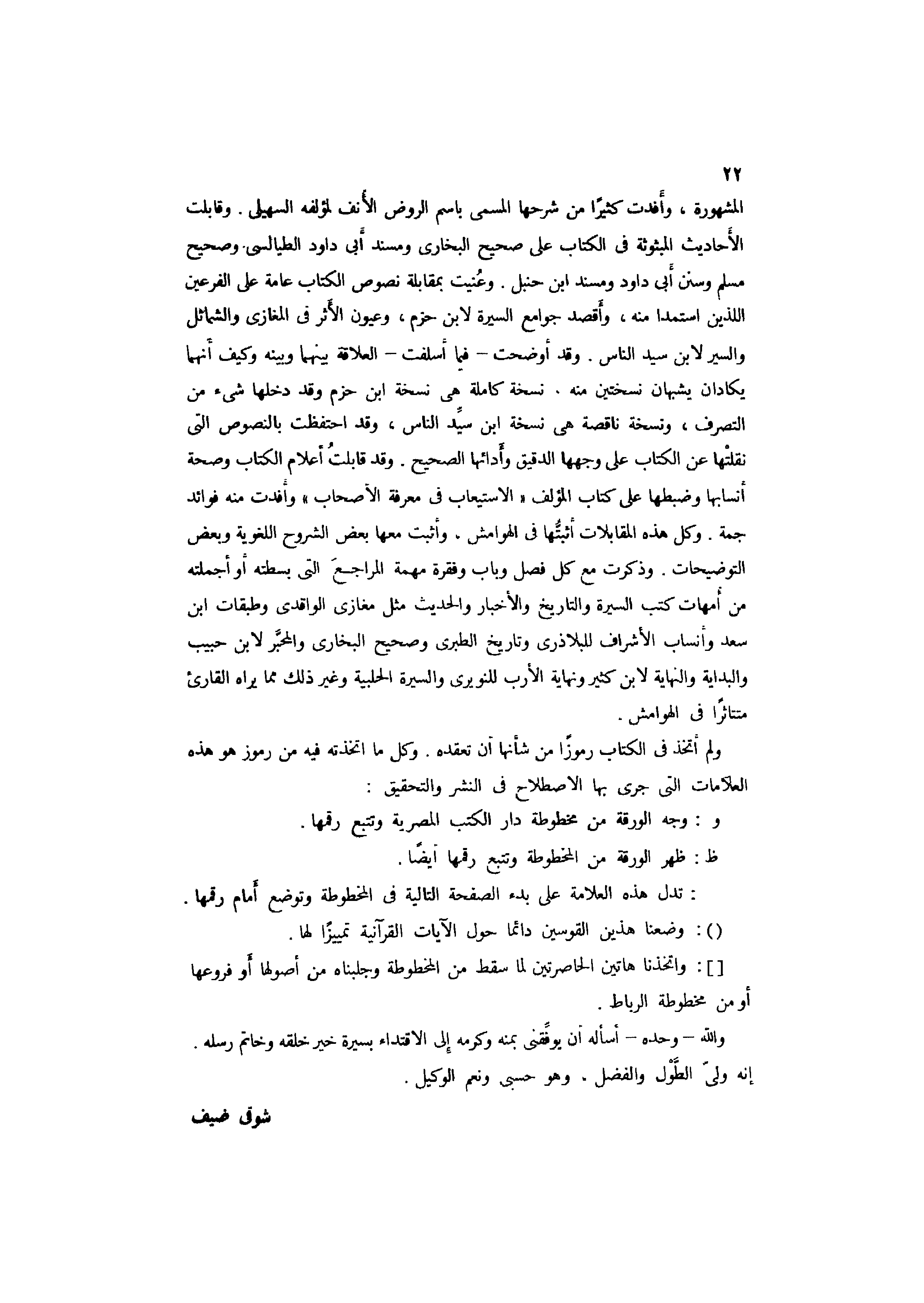 الْمَشْهُورَة، وأفدت كثيرا من شرحها الْمُسَمّى باسم الرَّوْض الْأنف لمؤلفه السُّهيْلي. وقابلت الْأَحَادِيث المبثوثة فِي الْكتاب على صَحِيح البُخَارِيّ ومسند أبي دَاوُد الطَّيَالِسِيّ وصحيح مُسلم وَسنَن أبي دَاوُد ومسند ابْن حَنْبَل. وعنيت بِمُقَابلَة نُصُوص الْكتاب عَامَّة على الفرعين اللَّذين استمدا مِنْهُ، وأقصد جَوَامِع السِّيرَة لِابْنِ حزم، وعيون الْأَثر فِي الْمَغَازِي وَالشَّمَائِل وَالسير لِابْنِ سيد النَّاس. وَقد أوضحت -فِيمَا أسلفت- العلاقة بَينهمَا وَبَينه وَكَيف أَنَّهُمَا يكادان يشبهان نسختين مِنْهُ: نُسْخَة كَامِلَة هِيَ نُسْخَة ابْن حزم وَقد دَخلهَا شَيْء من التَّصَرُّف، ونسخة نَاقِصَة هِيَ نُسْخَة ابْن سيد النَّاس، وَقد احتفظت بالنصوص الَّتِي نقلتها عَن الْكتاب على وَجههَا الدَّقِيق وأدائها الصَّحِيح. وَقد قابلت أَعْلَام الْكتاب وَصِحَّة أنسابها وضبطها على كتاب الْمُؤلف "الِاسْتِيعَاب فِي معرفَة الْأَصْحَاب" وأفدت مِنْهُ فَوَائِد جمة. وكل هَذِه المقابلات أثبتها فِي الهوامش. وَأثبت مَعهَا بعض الشُّرُوح اللُّغَوِيَّة وَبَعض التوضيحات. وَذكرت مَعَ كل فصل وَبَاب وفقرة مهمة المراجع الَّتِي بسطته أَو أجملته من أُمَّهَات كتب السِّيرَة والتاريخ وَالْأَخْبَار والْحَدِيث مثل مغازي الْوَاقِدِيّ وطبقات ابْن سعد وأنساب الْأَشْرَاف للبلاذري وتاريخ الطَّبَرِيّ وصحيح البُخَارِيّ والمحبر لِابْنِ حبيب والبداية وَالنِّهَايَة لِابْنِ كثير وَنِهَايَة الأرب للنويري والسيرة الحلبية وَغير ذَلِك مِمَّا يرَاهُ القاريء متناثرا فِي الهوامش.
