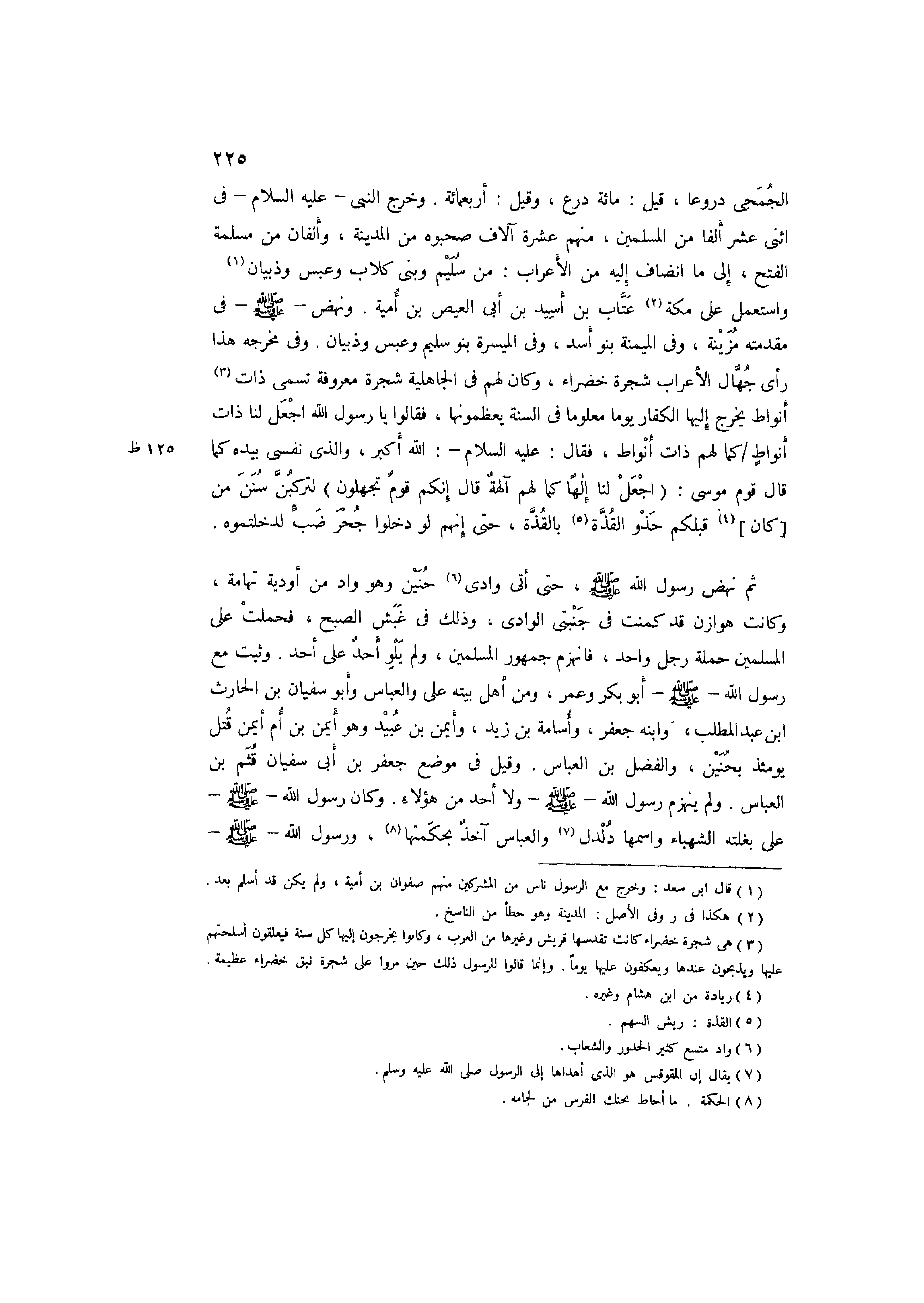 الجُمَحِي دروعا، قيل: مائَة درع، وَقيل: أَرْبَعمِائَة. وَخرج النَّبِي -عَلَيْهِ السَّلَام- فِي اثنى عشر ألفا من الْمُسلمين، مِنْهُم عشرَة آلَاف صحبوه من الْمَدِينَة، وَأَلْفَانِ من مسلمة الْفَتْح، إِلَى مَا انضاف إِلَيْهِ من الْأَعْرَاب: من سليم وَبني كلاب وَعَبس وذبيان1 وَاسْتعْمل على مَكَّة2 عتاب بْن أسيد بْن أبي الْعيص بْن أُميَّة. ونهض -صَلَّى اللَّهُ عَلَيْهِ وَسَلَّمَ- فِي مقدمته مزينة، وَفِي الميمنة بَنو أَسد، وَفِي الميسرة بَنو سليم وَعَبس وذبيان. وَفِي مخرجه هَذَا رأى جهال الْأَعْرَاب شَجَرَة خضراء، وَكَانَ لَهُم فِي الْجَاهِلِيَّة شَجَرَة مَعْرُوفَة تسمى ذَات3 أنواط يخرج إِلَيْهَا الْكفَّار يَوْمًا مَعْلُوما فِي السّنة يعظمونها، فَقَالُوا يَا رَسُول اللَّه اجْعَل لنا ذَات أنواط/ كَمَا لَهُم ذَات أنواط، فَقَالَ: عَلَيْهِ السَّلَام: اللَّه أكبر، وَالَّذِي نَفسِي بِيَدِهِ كَمَا قَالَ قوم مُوسَى: {اجْعَلْ لَنَا إِلَهًا كَمَا لَهُمْ آلِهَة قَالَ إِنَّكُم قوم تجهلون} لتركبن سنَن من [كَانَ] 4 قبلكُمْ حَذْو القذة5 بالقذة، حَتَّى إِنَّهُم لَو دخلُوا جُحر ضَب لدخلتموه.