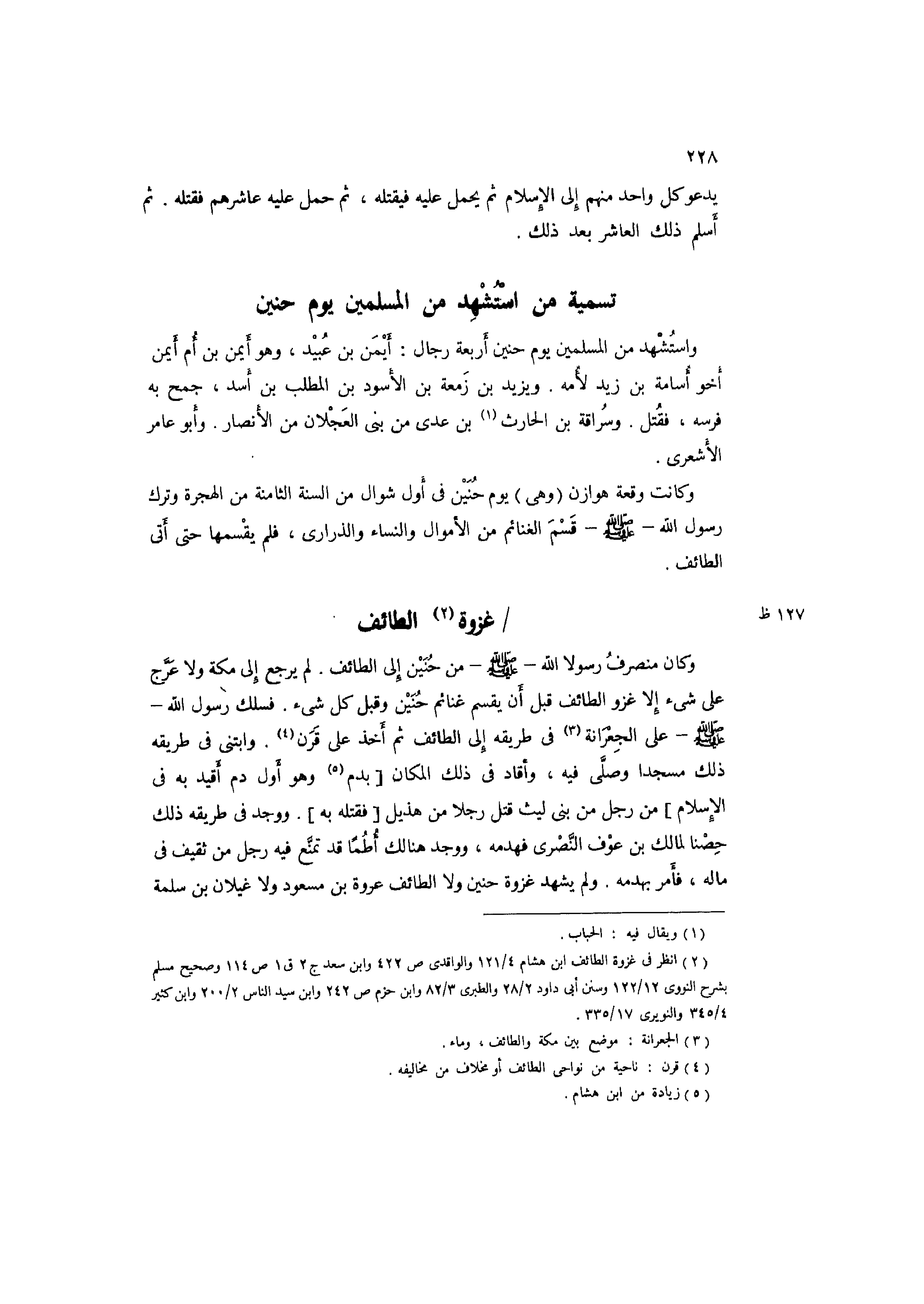 2 انْظُر فِي غَزْوَة الطَّائِف ابْن هِشَام 4/ 121 والواقدي ص422 وَابْن سعد ج2 ق1 ص114 وصحيح مُسلم بشرح النَّوَوِيّ 12/ 122 وَسنَن أبي دَاوُد 2/ 28 والطبري 3/ 82 وَابْن حزم ص242 وَابْن سيد النَّاس 2/ 200 وَابْن كثير 4/ 345 والنويري 17/ 335.