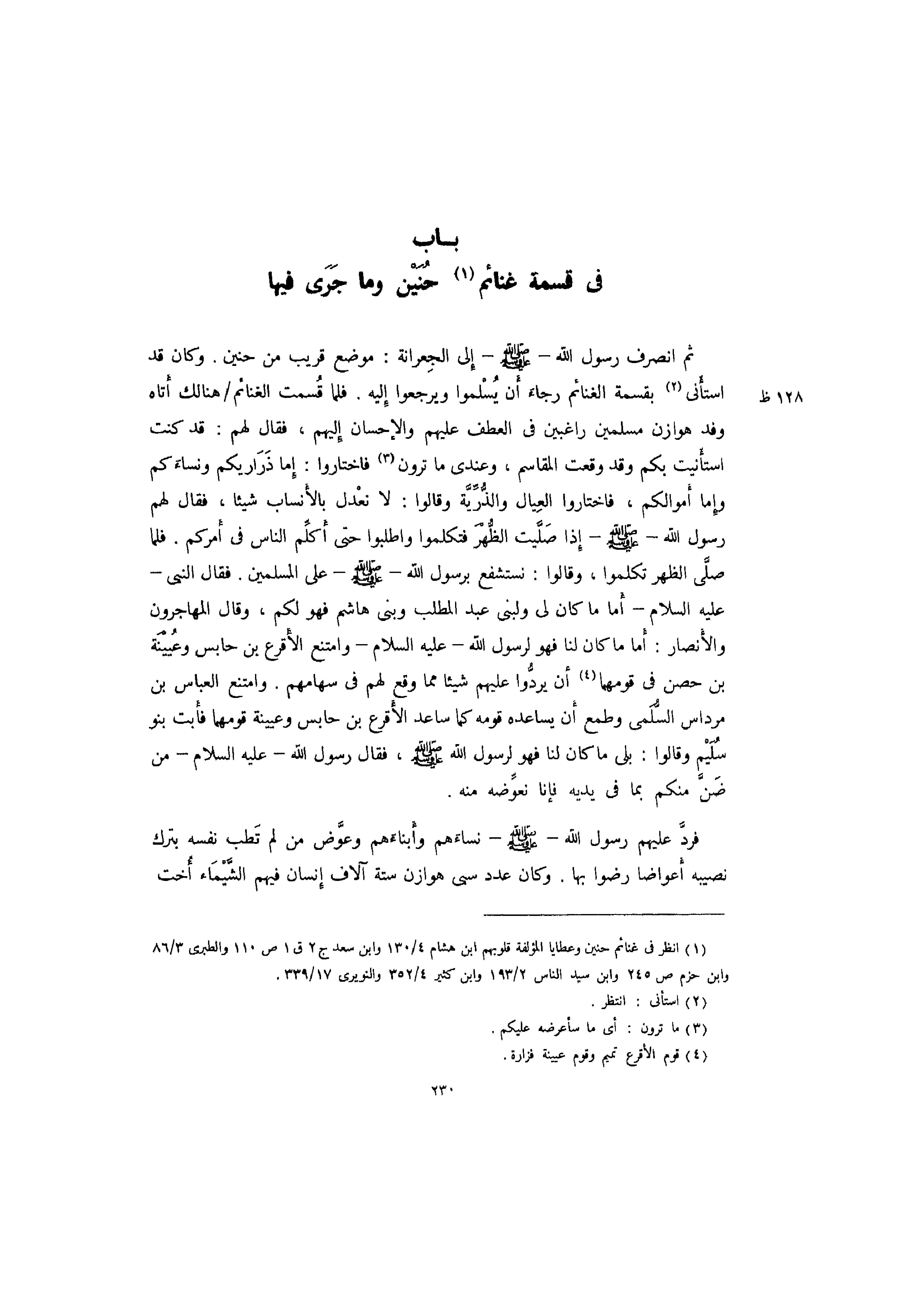 1 انْظُر فِي غَنَائِم حنين وعطايا الْمُؤَلّفَة قُلُوبهم ابْن هِشَام 4/ 130 وَابْن سعد ج2 ق1 ص110 والطبري 3/ 86 وَابْن حزم ص245 وَابْن سيد النَّاس 2/ 193 وَابْن كثير 4/ 352 والنويري 17/ 339.