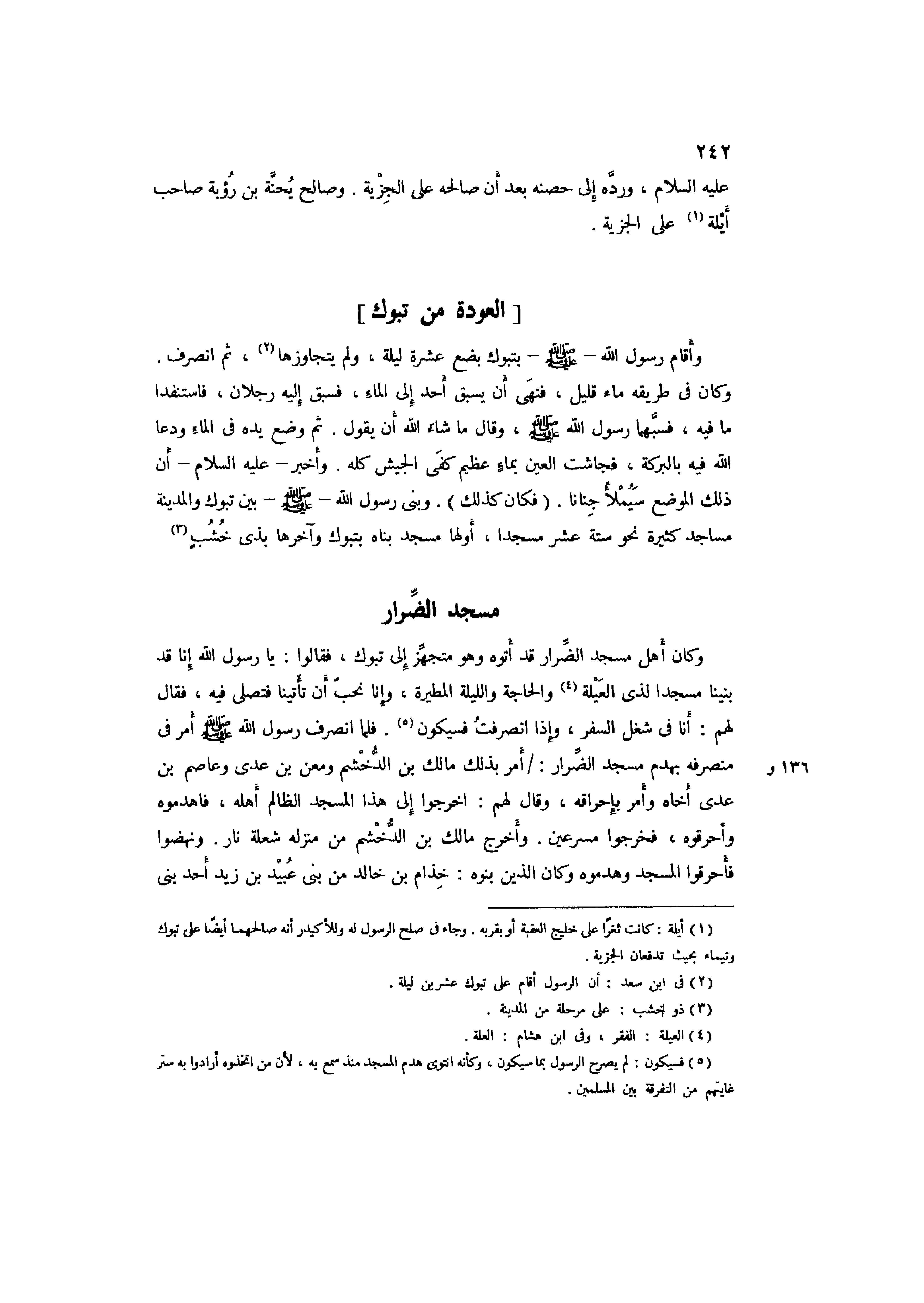 وَأقَام رَسُول اللَّه صَلَّى اللَّهُ عَلَيْهِ وَسَلَّمَ بتبوك بضع عشرَة لَيْلَة، وَلم يتجاوزها2، ثمَّ انْصَرف وَكَانَ فِي طَرِيقه مَاء قَلِيل، فَنهى أَن يسْبق أحد إِلَى المَاء، فَسبق إِلَيْهِ رجلَانِ، فاستنفدا مَا فِيهِ، فسبهما رَسُول اللَّهِ صَلَّى اللَّهُ عَلَيْهِ وَسَلَّمَ، وَقَالَ مَا شَاءَ اللَّه أَن يَقُول. ثمَّ وضع يَده فِي المَاء ودعا الله فِيهِ الْبركَة، فَجَاشَتْ الْعين بِمَاء عَظِيم كفى الْجَيْش كُله. وَأخْبر عَلَيْهِ السَّلَام أَن ذَلِك الْموضع سَيُمْلأُ جِنَانًا. فَكَانَ كَذَلِك. وَبنى رَسُول اللَّه صَلَّى اللَّهُ عَلَيْهِ وَسَلَّمَ بَين تَبُوك وَالْمَدينَة مَسَاجِد كَثِيرَة نَحْو سِتَّة عشر مَسْجِدا، أَولهَا مَسْجِد بناه بتبوك وَآخِرهَا بِذِي خشب3.
