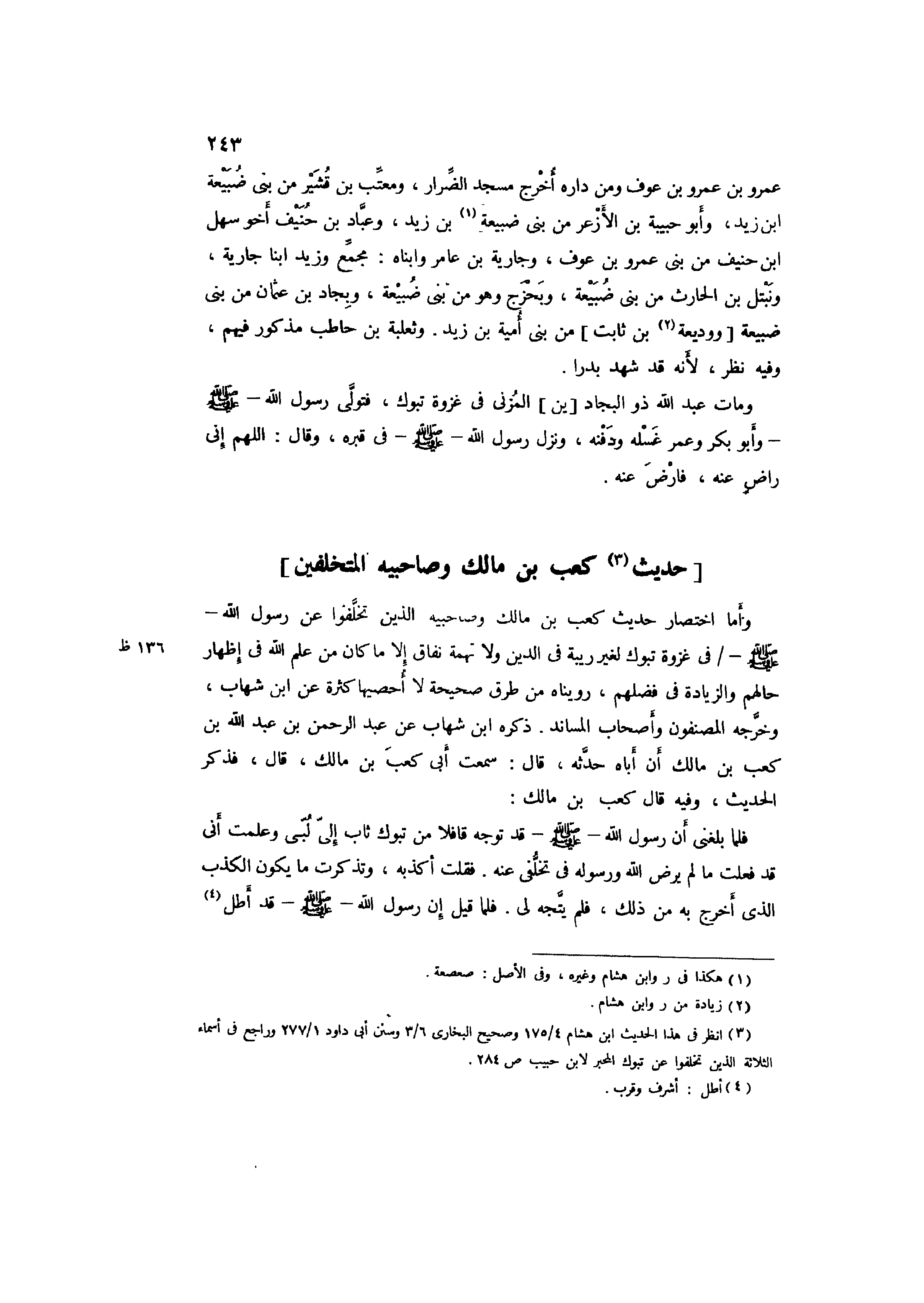 3 انْظُر فِي هَذَا الحَدِيث ابْن هِشَام 4/ 175 وصحيح البُخَارِيّ 6/ 3 وَسنَن أبي دَاوُد 1/ 277 وراجع فِي أَسمَاء الثَّلَاثَة الَّذين تخلفوا عَن تَبُوك المحبر لِابْنِ حبيب ص284.