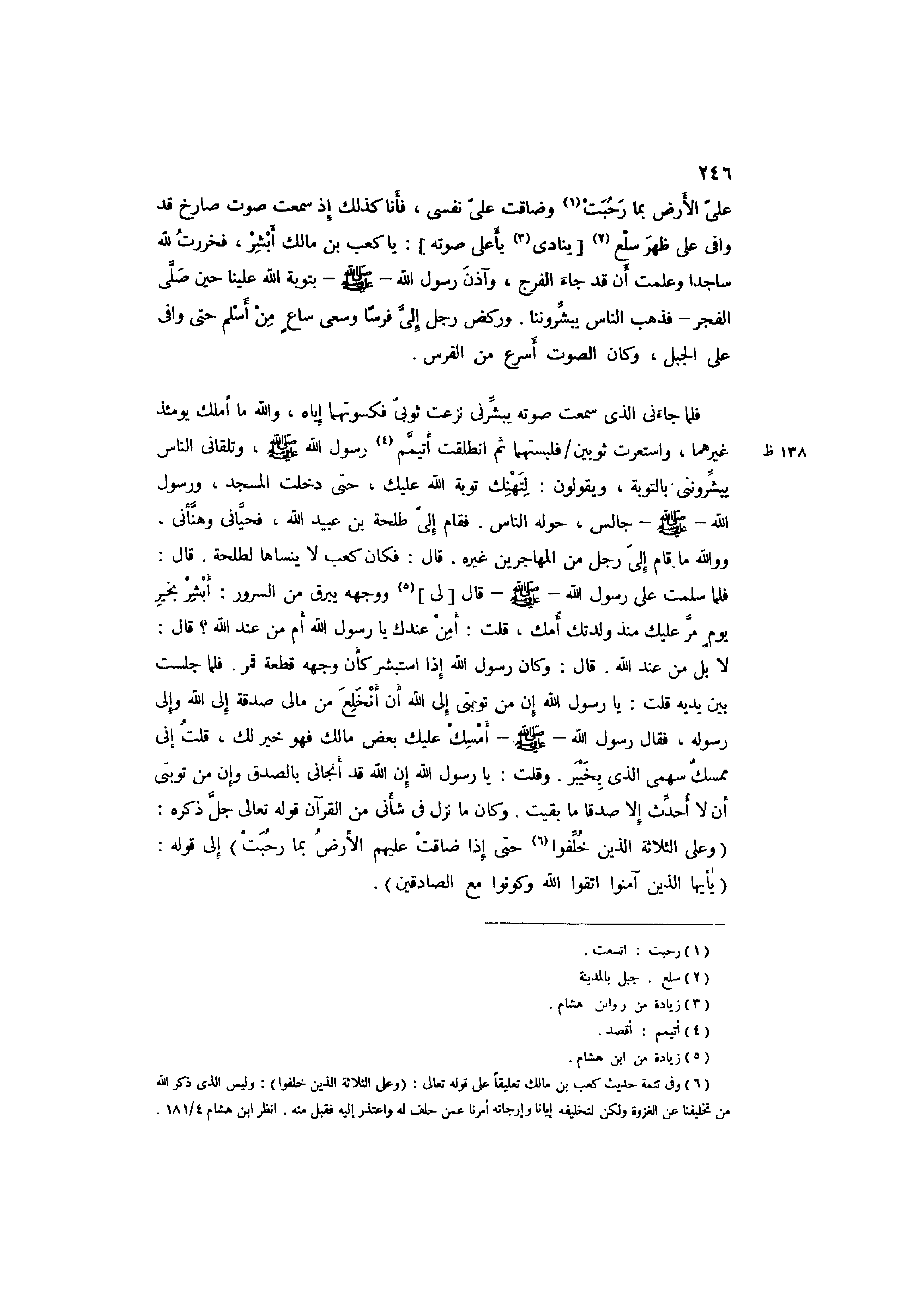 6 وَفِي تَتِمَّة حَدِيث كَعْب بن مَالك تَعْلِيقا على قَوْله تَعَالَى: {وعَلى الثَّلَاثَة الَّذين خلفوا} : وَلَيْسَ الَّذِي ذكر الله من تخليفنا عَن الْغَزْوَة وَلَكِن لتخليفه إيانا وإرجائه أمرنَا عَمَّن حلف لَهُ وَاعْتذر إِلَيْهِ فَقبل مِنْهُ. انْظُر ابْن هِشَام 4/ 181.