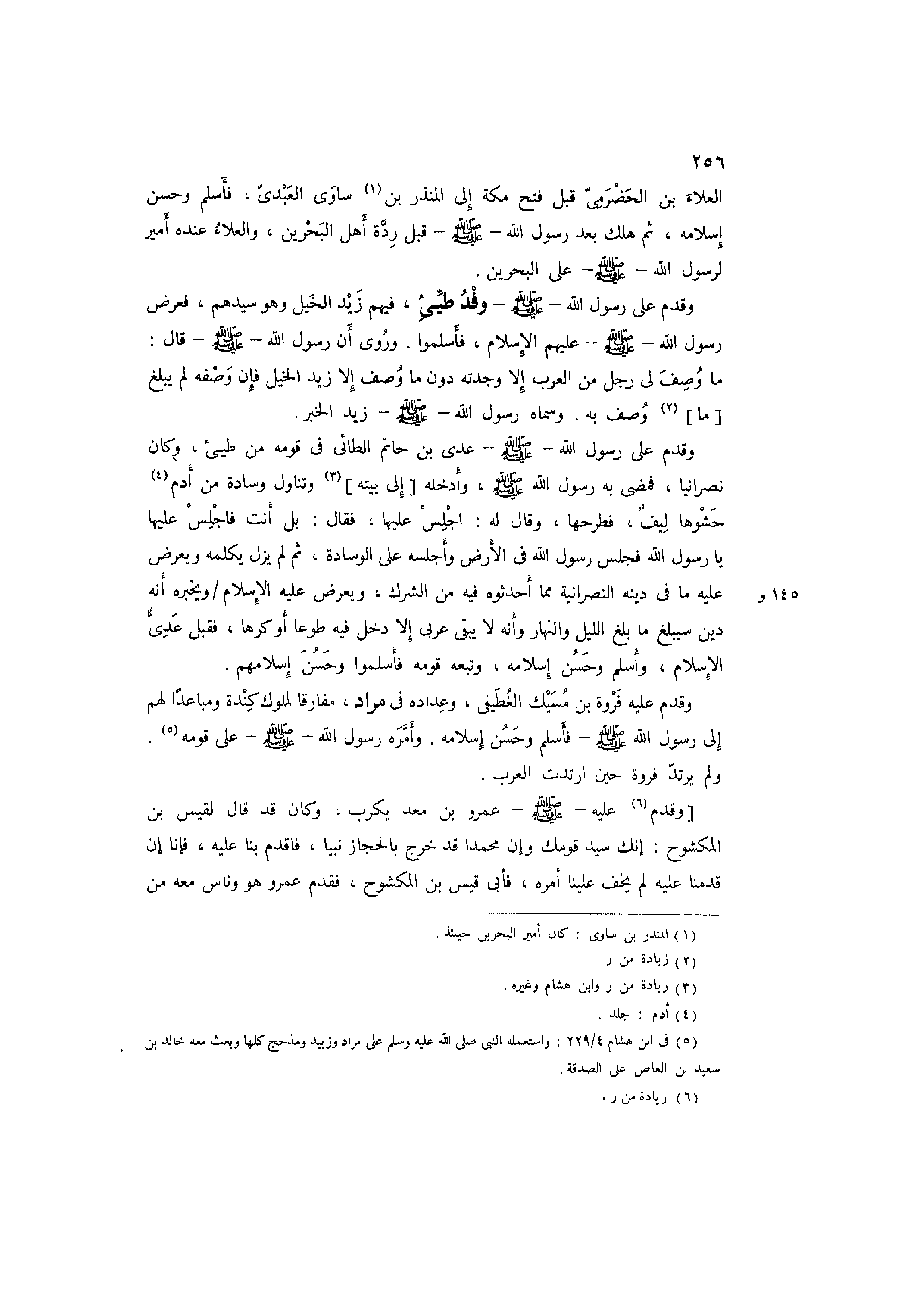 وَقدم على رَسُول اللَّه صَلَّى اللَّهُ عَلَيْهِ وَسَلَّمَ عدي بْن حَاتِم الطَّائِي فِي قومه من طييء، وَكَانَ نَصْرَانِيّا، فَمضى بِهِ رَسُول اللَّهِ صَلَّى اللَّهُ عَلَيْهِ وَسَلَّمَ، وَأدْخلهُ [إِلَى بَيته] 3 وَتَنَاول وسَادَة من أَدَم4 حشوها لِيف، فطرحها، وَقَالَ لَهُ: "اجْلِسْ عَلَيْهَا" فَقَالَ: بل أَنْت فاجلس عَلَيْهَا يَا رَسُول اللَّه، فَجَلَسَ رَسُول اللَّه فِي الأَرْض وَأَجْلسهُ على الوسادة، ثمَّ لم يزل يكلمهُ ويعرض عَلَيْهِ مَا فِي دِينِهِ النَّصْرَانِيَّةِ مِمَّا أحدثوه فِيهِ من الشّرك، ويعرض عَلَيْهِ الْإِسْلَام ويخبره أَنه دين سيبلغ مَا بلغ اللَّيْل وَالنَّهَار وَأَنه لَا يبْقى عَرَبِيّ إِلَّا دخل فِيهِ طَوْعًا أَو كرها، فَقبل عدي الْإِسْلَام، وَأسلم وَحسن إِسْلَامه، وَتَبعهُ قومه فأسلموا وَحسن إسْلَامهمْ.