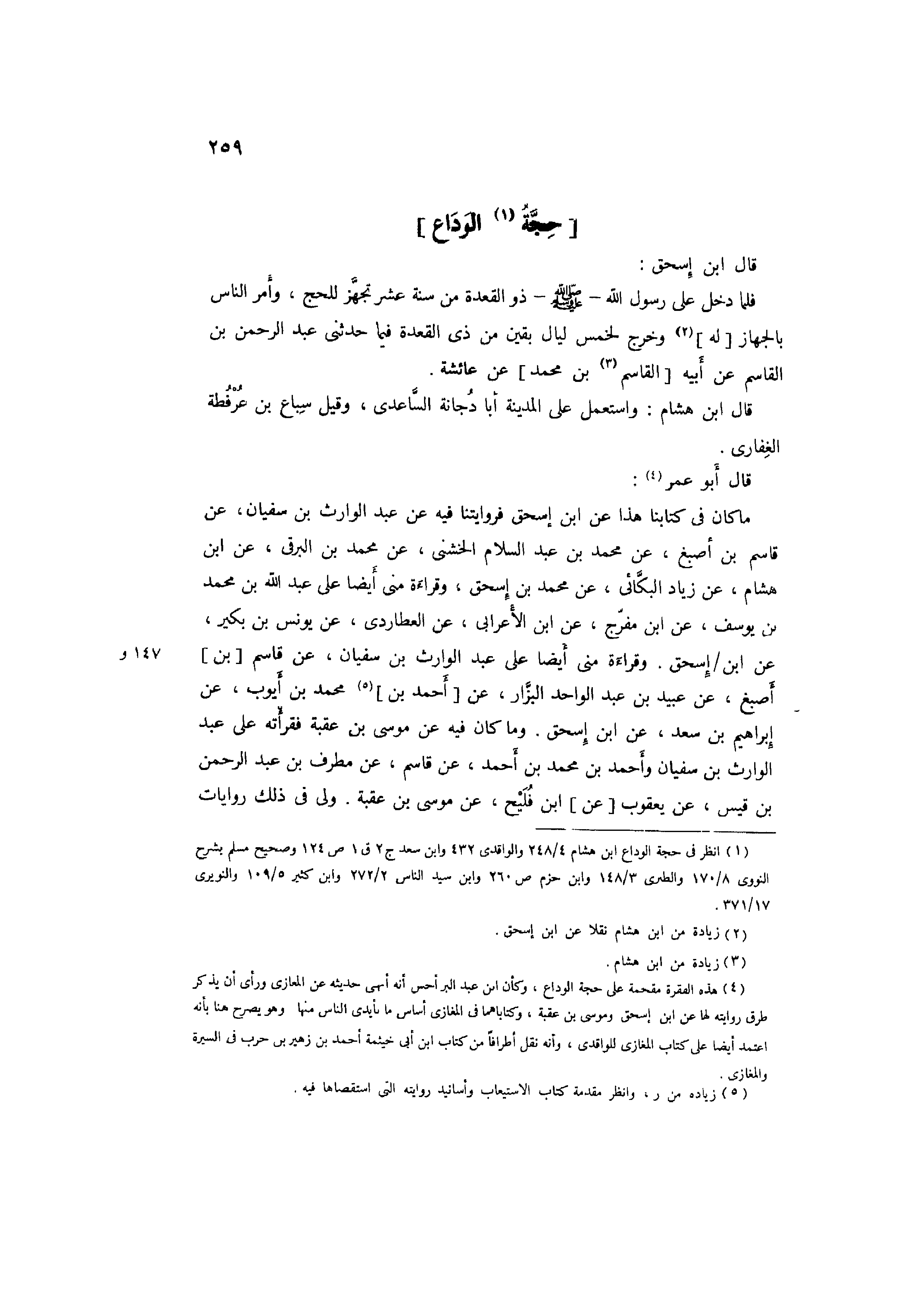4 هَذِه الْفَقْرَة مقحمة على حجَّة الْوَدَاع، وَكَأن ابْن عبد الْبر أحس أَنه أنهى حَدِيثه عَن الْمَغَازِي وَرَأى أَن يذكر طرق رِوَايَته لَهَا عَن ابْن إِسْحَاق ومُوسَى بْن عقبَة، وكتاباهما فِي الْمَغَازِي أساس مَا بأيدي النَّاس مِنْهَا. وَهُوَ يُصَرح هُنَا بِأَنَّهُ اعْتمد أَيْضا على كتاب الْمَغَازِي لِلْوَاقِدِي، وَأَنه نقل أطرافا من كتاب ابْن أبي خَيْثَمَة أَحْمَدُ بْنُ زُهَيْرِ بْنِ حَرْبٍ فِي السِّيرَة والمغازي.