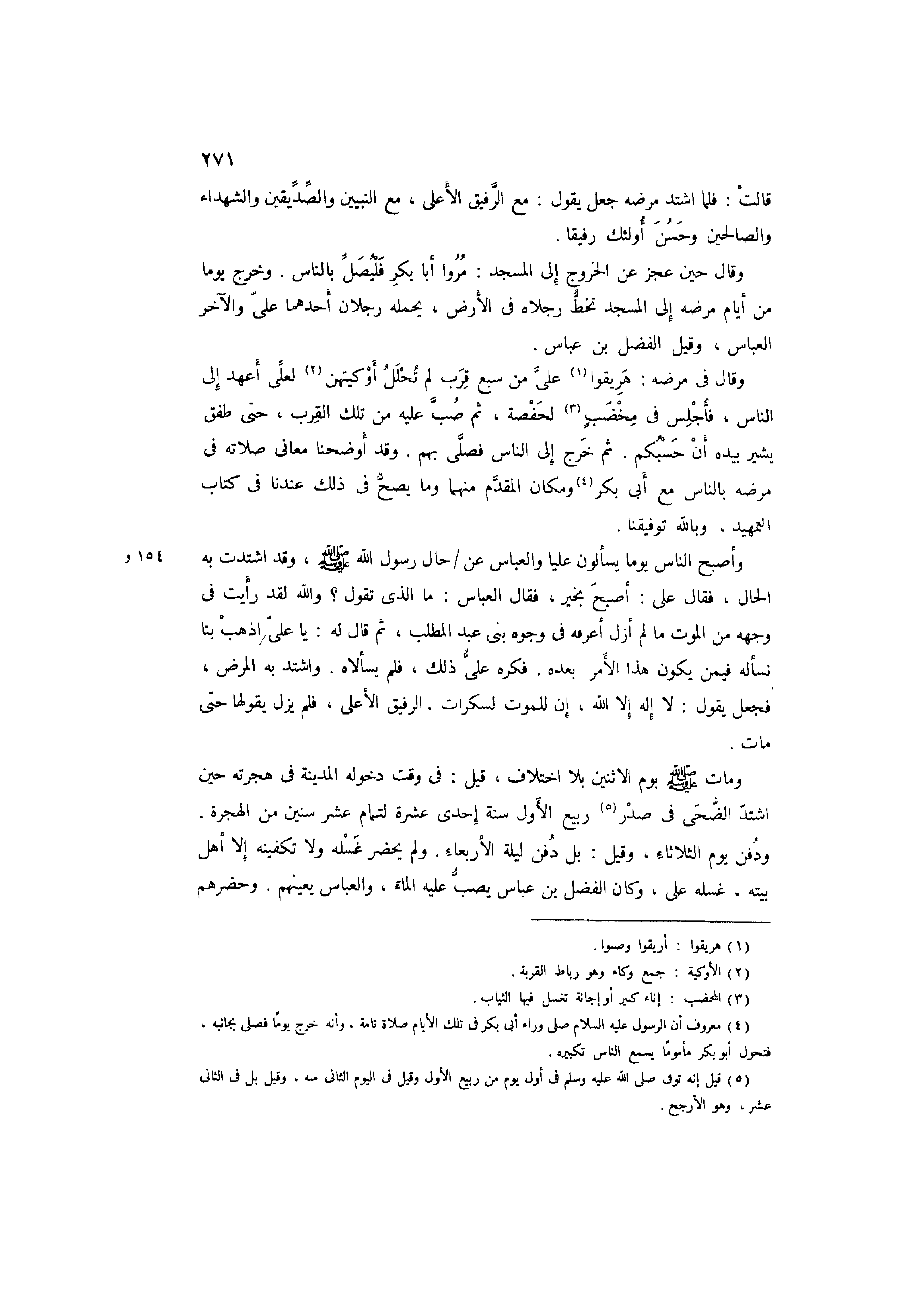 5 قيل إِنَّه توفّي صَلَّى اللَّهُ عَلَيْهِ وَسَلَّمَ فِي أول يَوْم من ربيع الأول وَقيل فِي الْيَوْم الثَّانِي مِنْهُ، وَقيل بل فِي الثَّانِي عشر، وَهُوَ الْأَرْجَح.