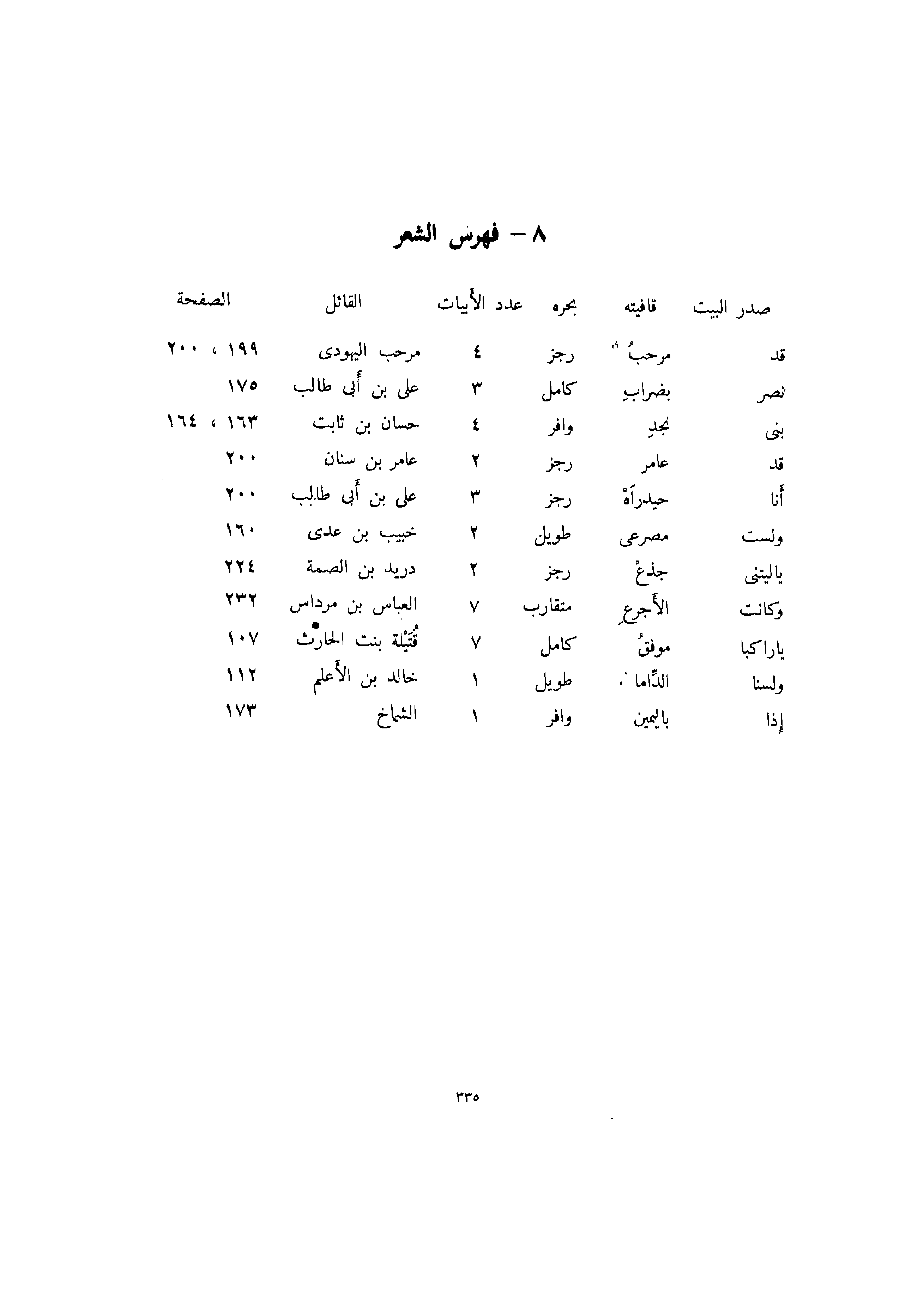 صدر الْبَيْت/ قافيته/ بحره/ عدد الأبيات/ الْقَائِل/ الصفحة