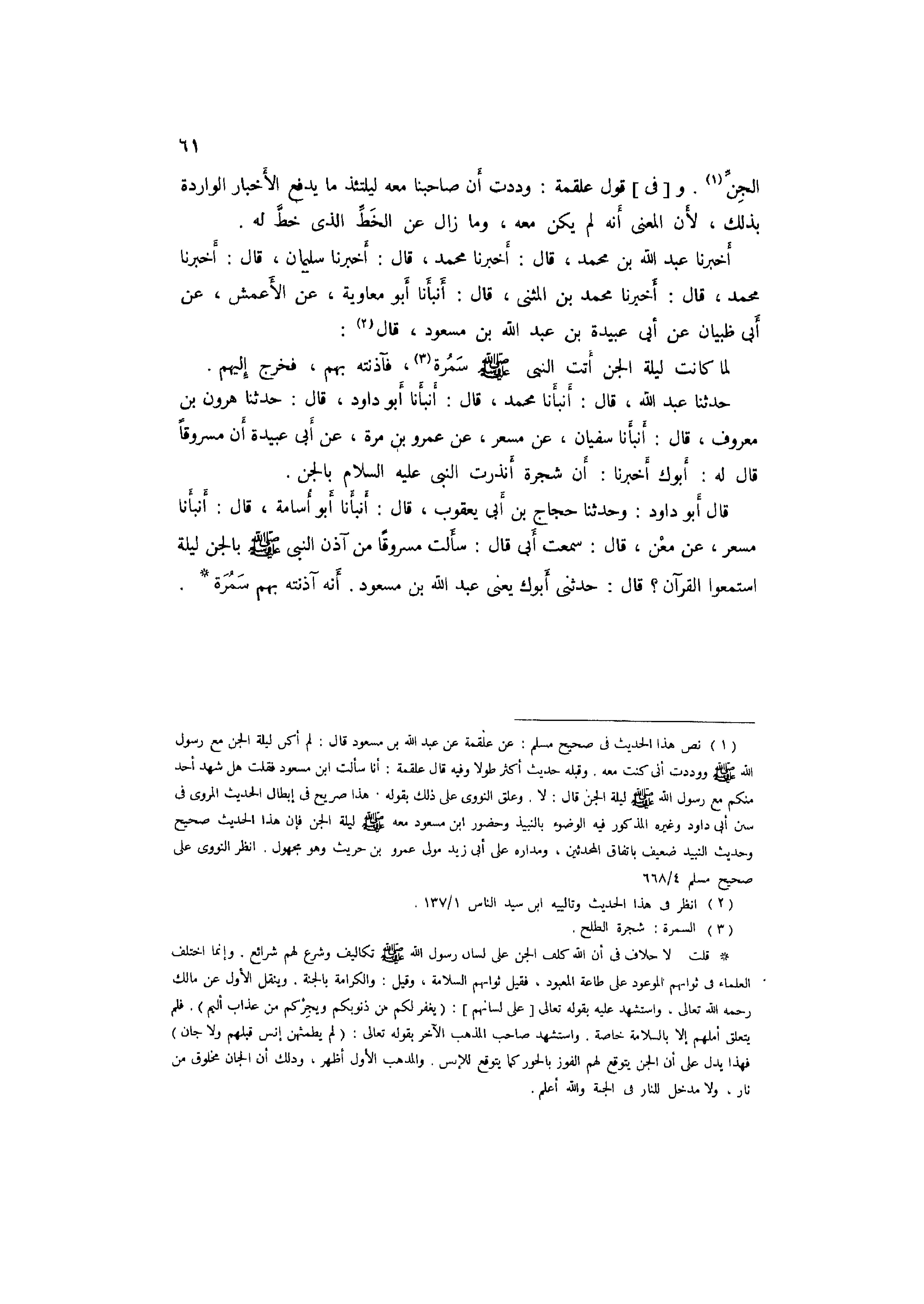 1 نَص هَذَا الحَدِيث فِي صَحِيح مُسلم: عَن عَلْقَمَة عَن عَبْدُ اللَّهِ بْنُ مَسْعُودٍ قَالَ: لم أكن لَيْلَة الْجِنّ مَعَ رَسُول اللَّه صَلَّى اللَّهُ عَلَيْهِ وَسلم ووددت أَنِّي كنت مَعَه. وَقَبله حَدِيث أَكثر طولا وَفِيه قَالَ عَلْقَمَة: أَنا سَأَلت ابْن مَسْعُود فَقلت: هَل شهد أحد مِنْكُم مَعَ رَسُول اللَّه صَلَّى اللَّهُ عَلَيْهِ وَسلم لَيْلَة الْجِنّ؟ قَالَ: لَا. وعلق النَّوَوِيّ على ذَلِك بقوله: هَذَا صَرِيح فِي إبِْطَال الحَدِيث الْمَرْوِيّ فِي سنَن أبي دَاوُد وَغَيره الْمَذْكُور فِيهِ الْوضُوء بالنبيذ وَحُضُور ابْن مَسْعُود مَعَه صَلَّى اللَّهُ عَلَيْهِ وَسَلَّمَ لَيْلَة الْجِنّ، فَإِن هَذَا الحَدِيث صَحِيح وَحَدِيث النَّبِيذ ضَعِيف بِاتِّفَاق الْمُحدثين، ومداره على أبي زيد مولى عَمْرو بن حُرَيْث وَهُوَ مَجْهُول. انْظُر النَّوَوِيّ على صَحِيح مُسلم 4/ 668.