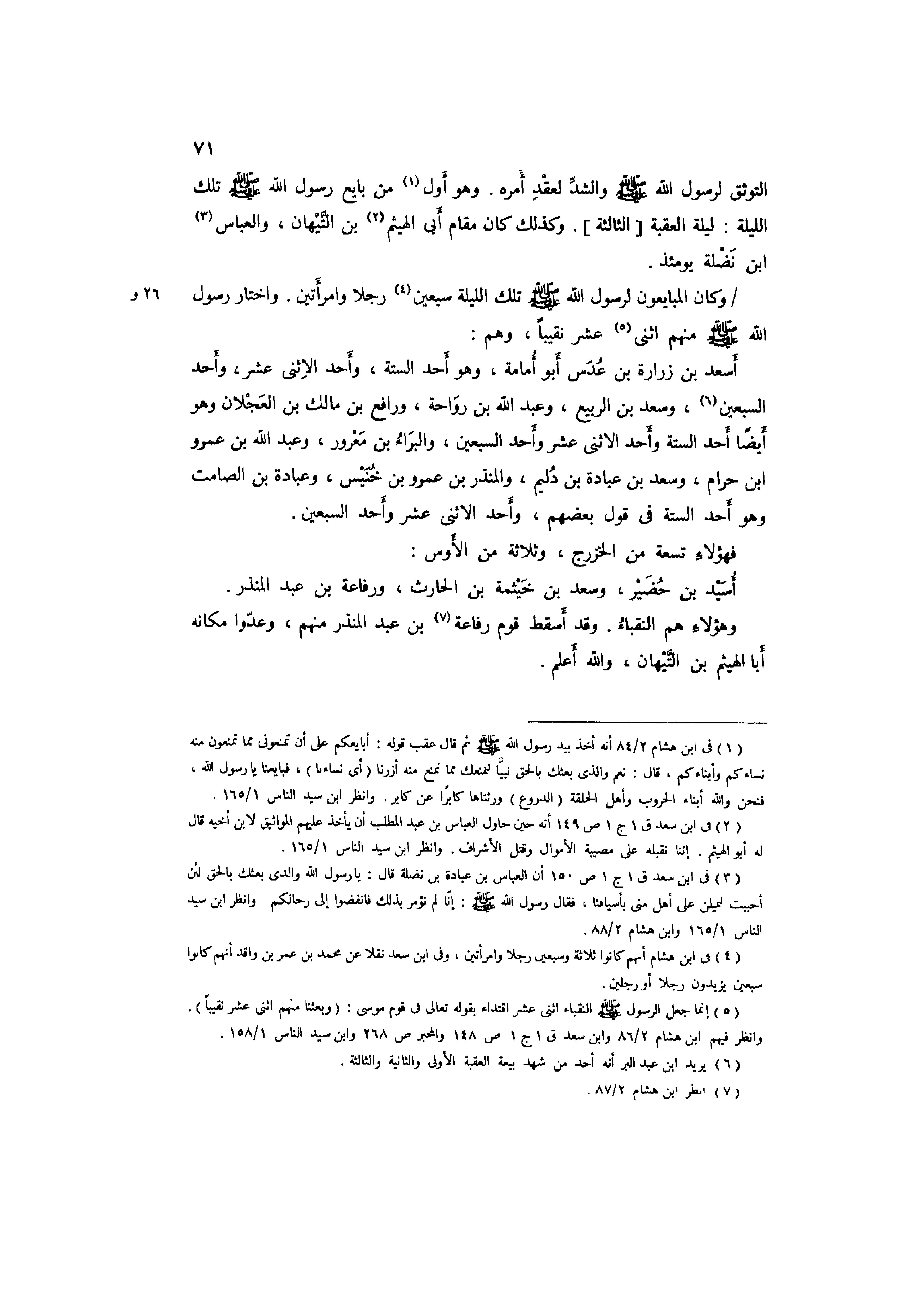 4 وَفِي ابْن هِشَام أَنهم كَانُوا ثَلَاثَة وَسبعين رجلا وَامْرَأَتَيْنِ، وَفِي ابْن سعد نقلا عَن مُحَمَّد بن عمر بن وَاقد أَنهم كَانُوا سبعين يزِيدُونَ رجلا أَو رجلَيْنِ.