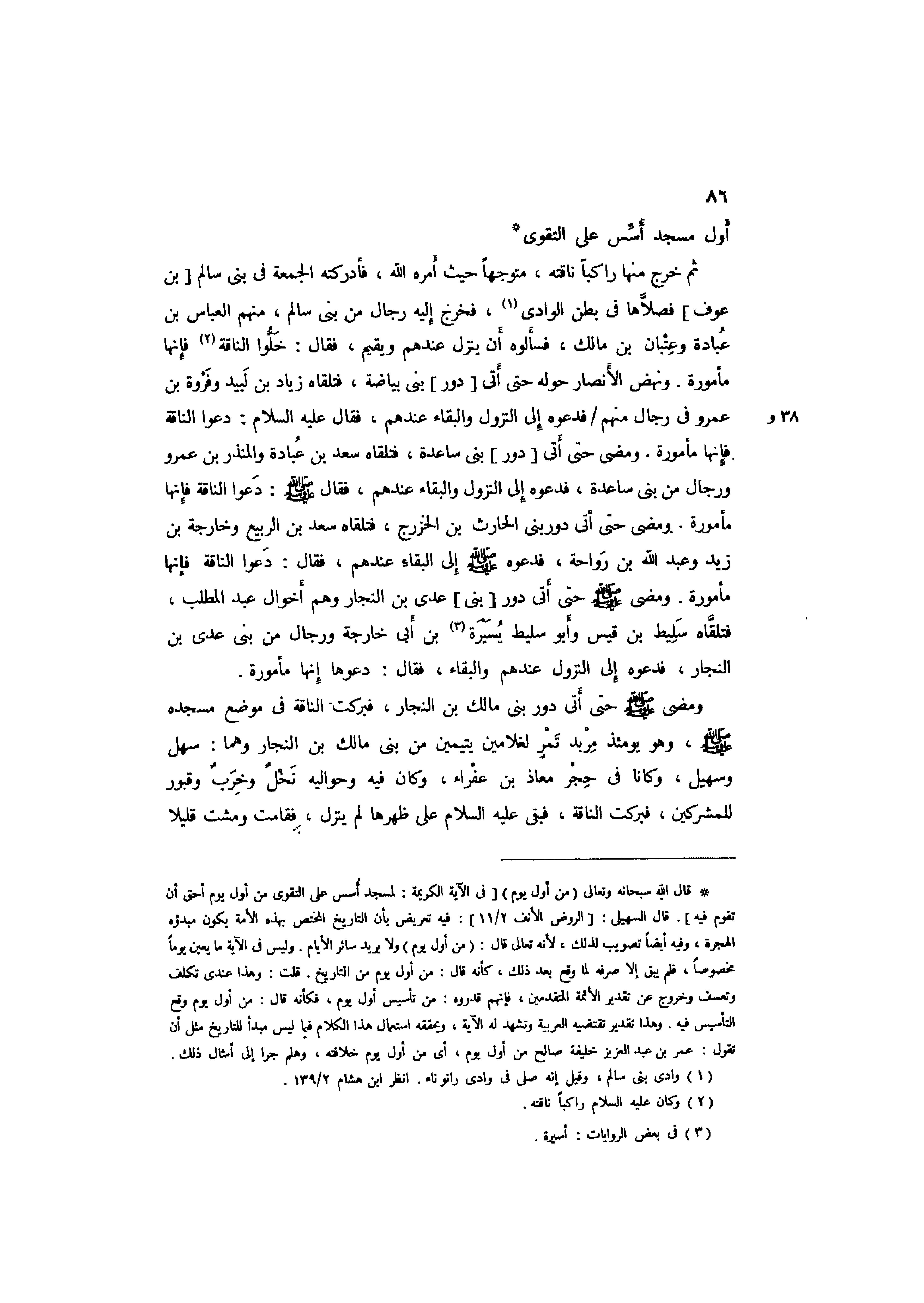 ثُمَّ خَرَجَ مِنْهَا رَاكِبًا نَاقَتَهُ، مُتَوَجِّهًا حَيْثُ أَمَرَهُ اللَّهُ، فَأَدْرَكَتْهُ الْجُمُعَةُ فِي بَنِي سَالِمِ [بْنِ عَوْفٍ] فَصَلاهَا فِي بَطْنِ الْوَادِي1، فَخرج إِلَيْهِ الرِّجَال مِنْ بَنِي سَالِمٍ، مِنْهُمُ الْعَبَّاسُ بْنُ عُبَادَةَ وَعَتْبَانُ بْنُ مَالِكٍ، فَسَأَلُوهُ أَنْ يَنْزِلَ عِنْدَهُمْ وَيُقِيمَ، فَقَالَ: "خَلُّوا النَّاقَةَ 2 فَإِنَّهَا مَأْمُورَةٌ". وَنَهَضَ الأَنْصَارُ حَوْلَهُ حَتَّى أَتَى [دُورَ] بَنِي بَيَاضَةَ، فَتَلَقَّاهُ زِيَادُ بْنُ لَبِيدٍ وَفَرْوَةُ بْنُ عَمْرٍو فِي رِجَالٍ مِنْهُمْ فَدَعَوْهُ إِلَى النُّزُولِ وَالْبَقَاءِ عِنْدَهُمْ، فَقَالَ عَلَيْهِ السَّلامُ: "دَعُوا النَّاقَةَ فَإِنَّهَا مَأْمُورَةٌ". وَمَضَى حَتَّى أَتَى [دُورَ] بَنِي سَاعِدَةَ، فَتَلَقَّاهُ سَعْدُ بْنُ عُبَادَةَ وَالْمُنْذِرُ بْنُ عَمْرٍو وَرِجَالٌ مِنْ بَنِي سَاعِدَةَ، فَدَعَوْهُ إِلَى النُّزُولِ وَالْبَقَاءِ عِنْدَهُمْ، فَقَالَ صَلَّى اللَّهُ عَلَيْهِ وَسَلَّمَ: "دَعُوا النَّاقَةَ فَإِنَّهَا مَأْمُورَةٌ". وَمَضَى حَتَّى أَتَى دُورَ بَنِي الْحَارِثِ بْنِ الْخَزْرَجِ، فَتَلَقَّاهُ سَعْدُ بْنُ الرَّبِيعِ وَخَارِجَةُ بْنُ زَيْدٍ وَعَبْدُ اللَّهِ بْنُ رَوَاحَةَ، فَدَعَوْهُ صَلَّى اللَّهُ عَلَيْهِ وَسَلَّمَ إِلَى الْبَقَاءِ عِنْدَهُمْ، فَقَالَ: "دَعُوا النَّاقَةَ فَإِنَّهَا مَأْمُورَةٌ". وَمَضَى صَلَّى اللَّهُ عَلَيْهِ وَسَلَّمَ حَتَّى أَتَى دُورَ [بَنِي] عَدِيِّ بْنِ النَّجَّارِ وَهُمْ أَخْوَالُ عَبْدِ الْمُطَّلِبِ، فَتَلَقَّاهُ سَلِيطُ بْنُ قَيْسٍ وَأَبُو سَلِيطٍ يَسِيرَةُ3 بْنُ أَبِي خَارِجَةَ وَرِجَالٌ مِنْ بَنِي عَدِيِّ بْنِ النَّجَّارِ، فَدَعَوْهُ إِلَى النُّزُولِ عِنْدَهُمْ وَالْبَقَاءِ، فَقَالَ: "دَعُوهَا إِنَّهَا مَأْمُورَةٌ".