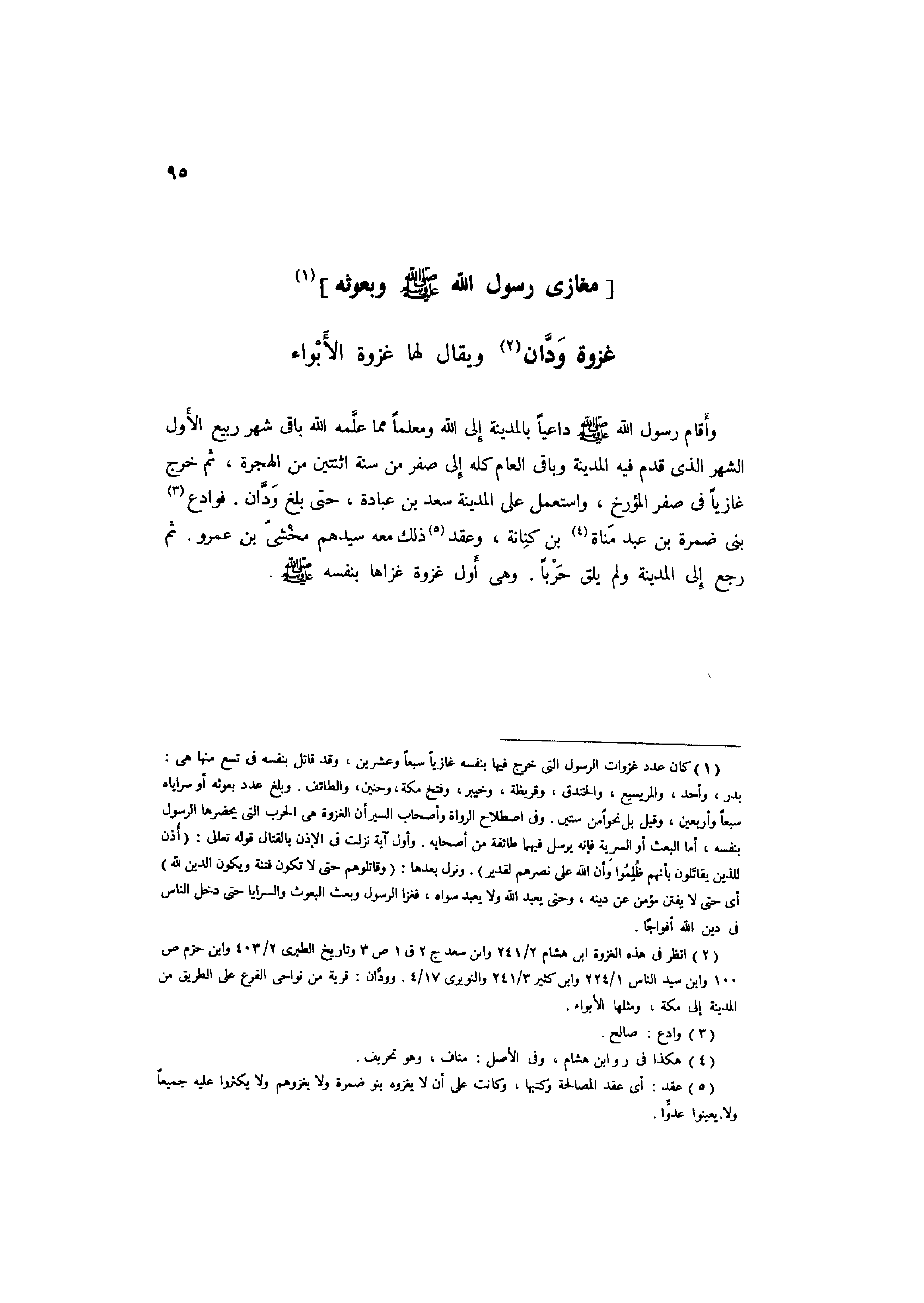 وَأقَام رَسُولُ اللَّهِ صَلَّى اللَّهُ عَلَيْهِ وَسَلَّمَ دَاعيا بِالْمَدِينَةِ إِلَى اللَّه ومعلما مِمَّا علمه اللَّه بَاقِي شهر ربيع الأول الشَّهْر الَّذِي قدم فِيهِ الْمَدِينَة وَبَاقِي الْعَام كُله إِلَى صفر من سنة اثْنَتَيْنِ من الْهِجْرَة، ثمَّ خرج غازيا فِي صفر المؤرخ، وَاسْتعْمل على الْمَدِينَة سعد بْن عبَادَة، حَتَّى بلغ ودان. فوادع3 بني ضَمرَة بْن عَبْد مَنَاة4 بْن كنَانَة، وَعقد5 ذَلِك مَعَه سيدهم مخشي بْن عَمْرو. ثمَّ رَجَعَ إِلَى الْمَدِينَة وَلم يلق حَربًا. وَهِي أول غَزْوَة غَزَاهَا بِنَفسِهِ صلى الله عَلَيْهِ وَسلم.