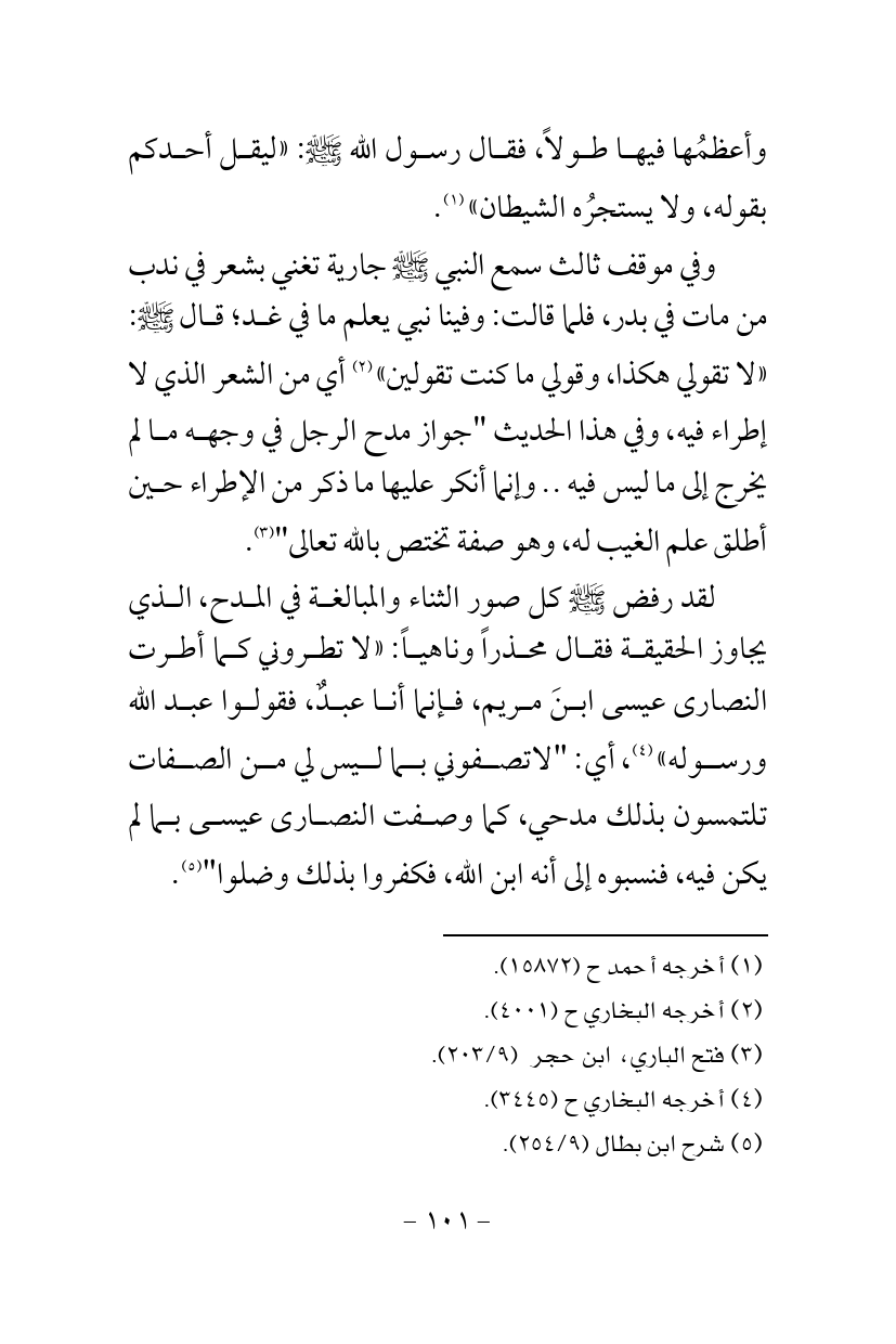 وفي موقف ثالث سمع النبي - صلى الله عليه وسلم - جارية تغني بشعر في ندب من مات في بدر، فلما قالت: وفينا نبي يعلم ما في غد؛ قال - صلى الله عليه وسلم -: «لا تقولي هكذا، وقولي ما كنت تقولين» (¬2) أي من الشعر الذي لا إطراء فيه، وفي هذا الحديث "جواز مدح الرجل في وجهه ما لم يخرج إلى ما ليس فيه .. وإنما أنكر عليها ما ذكر من الإطراء حين أطلق علم الغيب له، وهو صفة تختص بالله تعالى" (¬3).