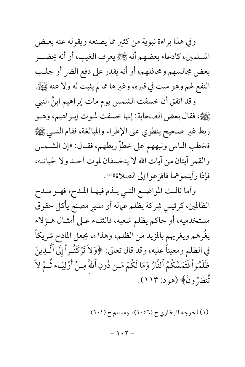 وقد اتفق أن خسفت الشمس يوم مات إبراهيم ابنُ النبي - صلى الله عليه وسلم -، فقال بعض الصحابة: إنها خسفت لموت إبراهيم، وهو ربط غير صحيح ينطوي على الإطراء والمبالغة، فقام النبي - صلى الله عليه وسلم - فخطب الناس ونبههم على خطأِ ربطهم، فقال: «إن الشمس والقمر آيتان من آيات الله لا ينخسفان لموت أحد ولا لحياته، فإذا رأيتموهما فافزعوا إلى الصلاة» (¬1).