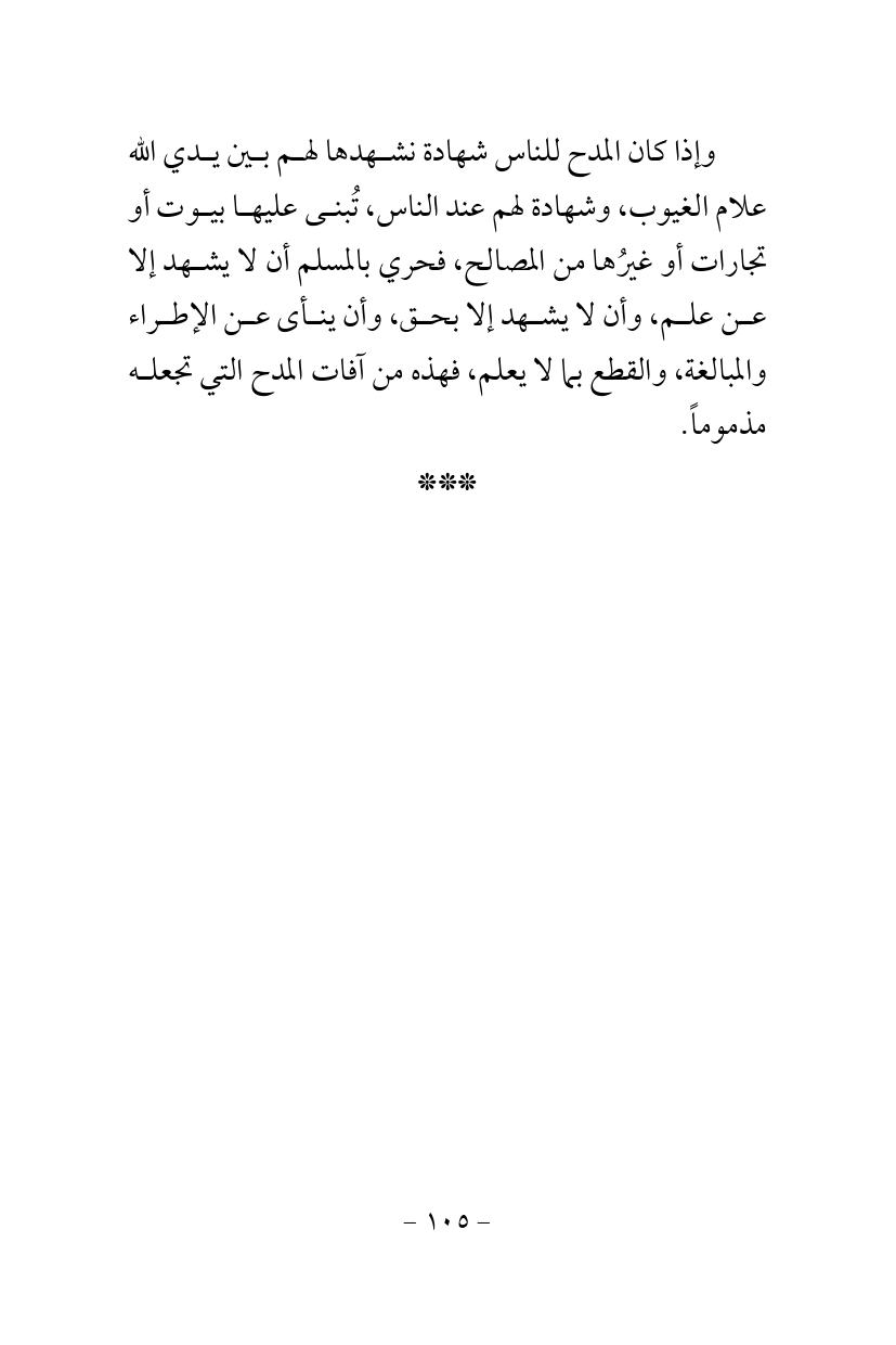 وإذا كان المدح للناس شهادة نشهدها لهم بين يدي الله علام الغيوب، وشهادة لهم عند الناس، تُبنى عليها بيوت أو تجارات أو غيرُها من المصالح، فحري بالمسلم أن لا يشهد إلا عن علم، وأن لا يشهد إلا بحق، وأن ينأى عن الإطراء والمبالغة، والقطع بما لا يعلم، فهذه من آفات المدح التي تجعله مذموماً.