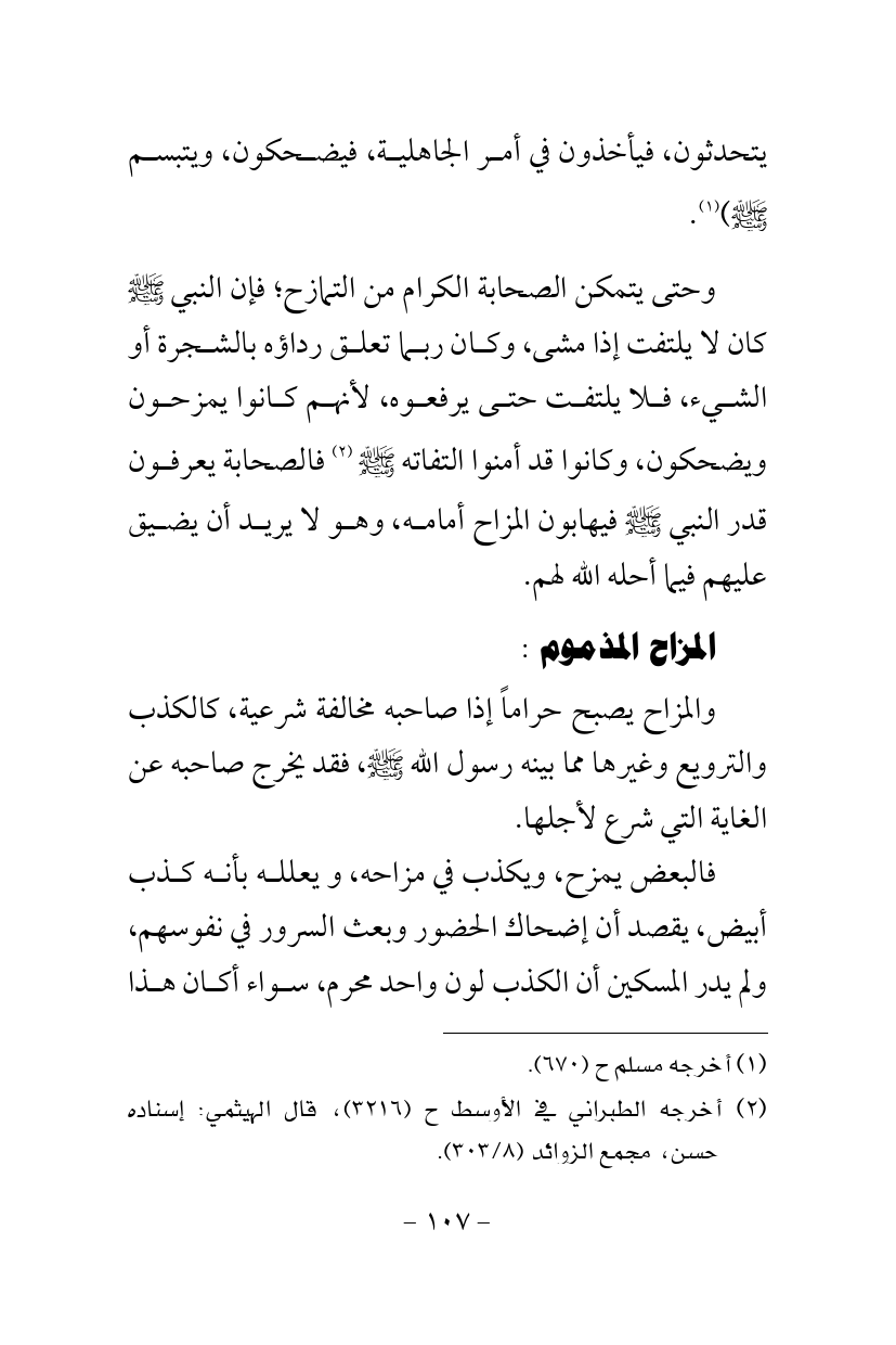 وحتى يتمكن الصحابة الكرام من التمازح؛ فإن النبي - صلى الله عليه وسلم - كان لا يلتفت إذا مشى، وكان ربما تعلق رداؤه بالشجرة أو الشيء، فلا يلتفت حتى يرفعوه، لأنهم كانوا يمزحون ويضحكون، وكانوا قد أمنوا التفاته - صلى الله عليه وسلم - (¬2) فالصحابة يعرفون قدر النبي - صلى الله عليه وسلم - فيهابون المزاح أمامه، وهو لا يريد أن يضيق عليهم فيما أحله الله لهم.