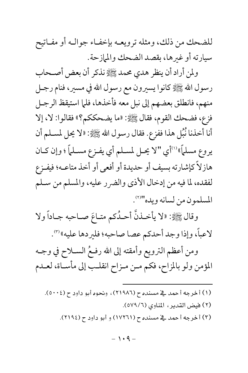 ولمن أراد أن ينظر هدي محمد - صلى الله عليه وسلم - نذكر أن بعض أصحاب رسول الله - صلى الله عليه وسلم - كانوا يسيرون مع رسول الله في مسير، فنام رجل منهم، فانطلق بعضهم إلى نبل معه فأخذها، فلما استيقظ الرجل فزع، فضحك القوم، فقال - صلى الله عليه وسلم -: «ما يضحككم؟» فقالوا: لا، إلا أنا أخذنا نُبُل هذا ففزع. فقال رسول الله - صلى الله عليه وسلم -: «لا يحل لمسلم أن يروع مسلماً» (¬1) أي "لا يحل لمسلم أي يفزع مسلماً؛ وإن كان هازلاً كإشارته بسيف أو حديدة أو أفعى أو أخذ متاعه؛ فيفزع لفقده، لما فيه من إدخال الأذى والضرر عليه، والمسلم من سلم المسلمون من لسانه ويده" (¬2).