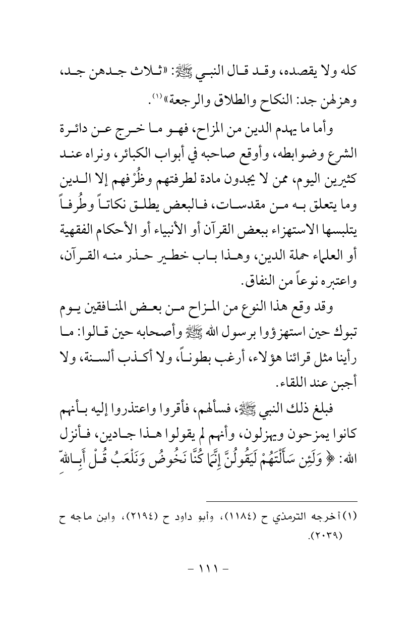 وأما ما يهدم الدين من المزاح، فهو ما خرج عن دائرة الشرع وضوابطه، وأوقع صاحبه في أبواب الكبائر، ونراه عند كثيرين اليوم، ممن لا يجدون مادة لطرفتهم وظُرْفهم إلا الدين وما يتعلق به من مقدسات، فالبعض يطلق نكاتاً وطُرفاً يتلبسها الاستهزاء ببعض القرآن أو الأنبياء أو الأحكام الفقهية أو العلماء حملة الدين، وهذا باب خطير حذر منه القرآن، واعتبره نوعاً من النفاق.