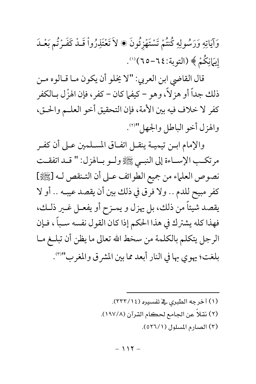 والإمام ابن تيمية ينقل اتفاق المسلمين على أن كفر مرتكب الإساءة إلى النبي - صلى الله عليه وسلم - ولو بالهزل: " قد اتفقت نصوص العلماء من جميع الطوائف على أن التنقص له [- صلى الله عليه وسلم -] كفر مبيح للدم .. ولا فرق في ذلك بين أن يقصد عيبه .. أو لا يقصد شيئاً من ذلك، بل يهزل ويمزح أو يفعل غير ذلك، فهذا كله يشترك في هذا الحكم إذا كان القول نفسه سباً، فإن الرجل يتكلم بالكلمة من سخط الله تعالى ما يظن أن تبلغ ما بلغت؛ يهوي بها في النار أبعد مما بين المشرق والمغرب" (¬3).