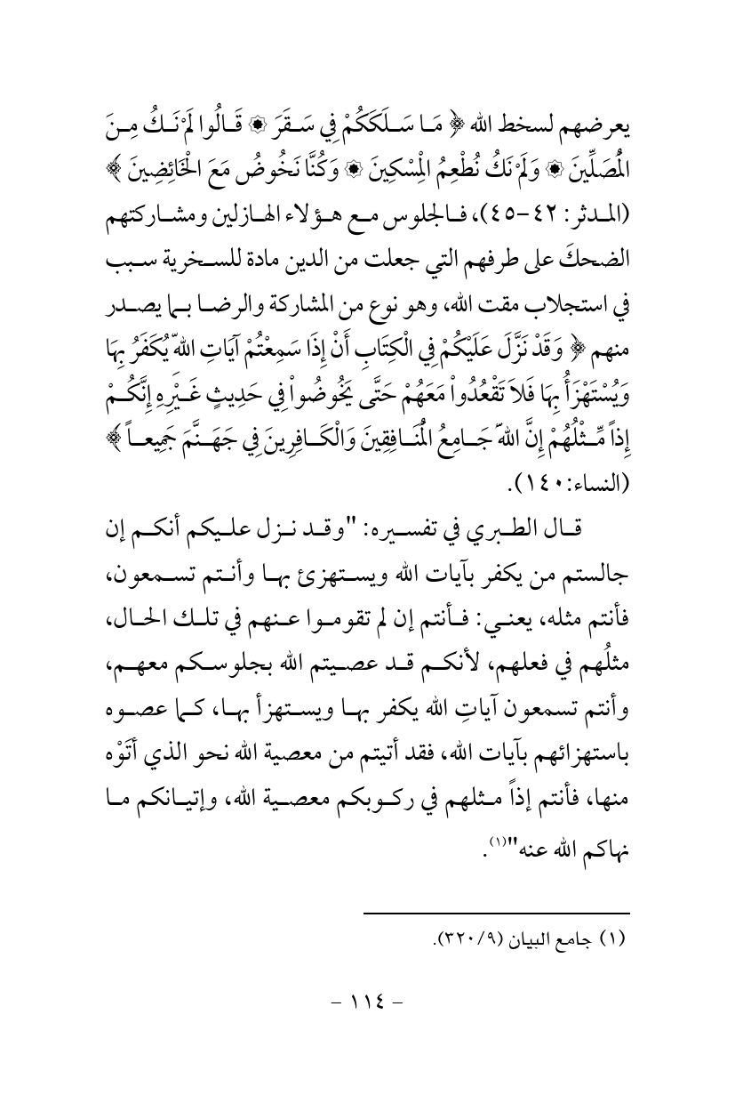قال الطبري في تفسيره: "وقد نزل عليكم أنكم إن جالستم من يكفر بآيات الله ويستهزئ بها وأنتم تسمعون، فأنتم مثله، يعني: فأنتم إن لم تقوموا عنهم في تلك الحال، مثلُهم في فعلهم، لأنكم قد عصيتم الله بجلوسكم معهم، وأنتم تسمعون آياتِ الله يكفر بها ويستهزأ بها، كما عصوه باستهزائهم بآيات الله، فقد أتيتم من معصية الله نحو الذي أتَوْه منها، فأنتم إذاً مثلهم في ركوبكم معصية الله، وإتيانكم ما نهاكم الله عنه" (¬1).