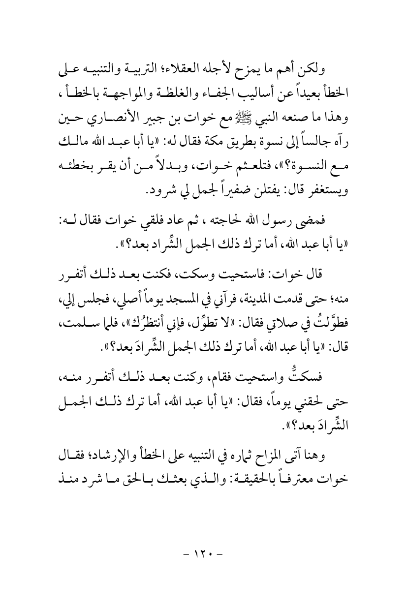 ولكن أهم ما يمزح لأجله العقلاء؛ التربية والتنبيه على الخطأ بعيداً عن أساليب الجفاء والغلظة والمواجهة بالخطأ، وهذا ما صنعه النبي - صلى الله عليه وسلم - مع خوات بن جبير الأنصاري حين رآه جالساً إلى نسوة بطريق مكة فقال له: «يا أبا عبد الله مالك مع النسوة؟»، فتلعثم خوات، وبدلاً من أن يقر بخطئه ويستغفر قال: يفتلن ضفيراً لجمل لي شرود.