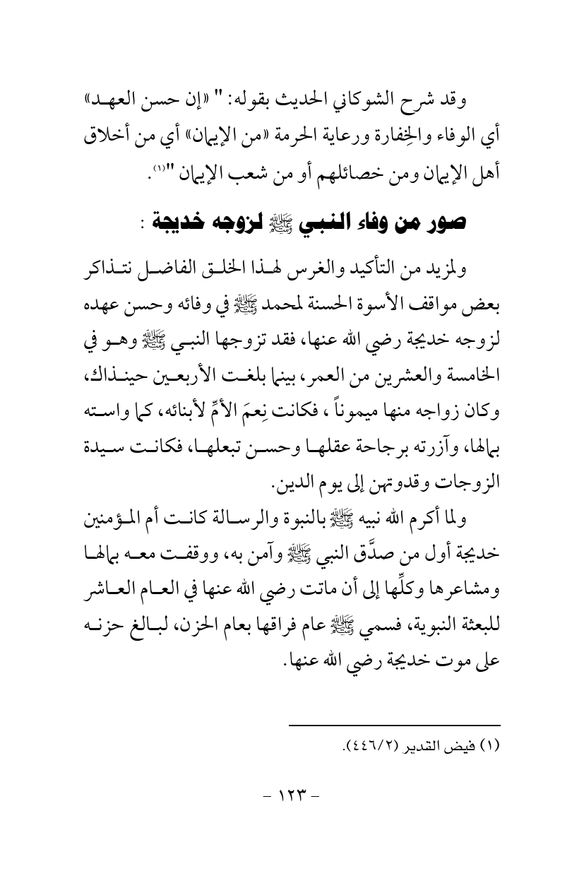 وقد شرح الشوكاني الحديث بقوله: " «إن حسن العهد» أي الوفاء والخِفارة ورعاية الحرمة «من الإيمان» أي من أخلاق أهل الإيمان ومن خصائلهم أو من شعب الإيمان " (¬1).