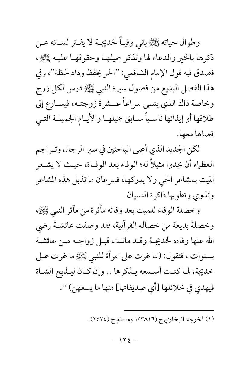 وطوال حياته - صلى الله عليه وسلم - بقي وفياً لخديجة لا يفتر لسانه عن ذكرها بالخير والدعاء لها وتذكر جميلها وحقوقها عليه - صلى الله عليه وسلم -، فصدق فيه قول الإمام الشافعي: "الحر يحفظ وداد لحظة"، وفي هذا الفصل البديع من فصول سيرة النبي - صلى الله عليه وسلم - درس لكل زوج وخاصة ذاك الذي ينسى سراعاً عشرة زوجته، فيسارع إلى طلاقها أو إيذائها ناسياً سابق جميلها والأيام الجميلة التي قضاها معها.
