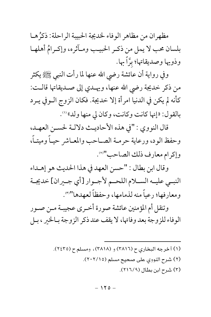 وقال ابن بطال: "حسن العهد في هذا الحديث هو إهداء النبي عليه السلام اللحم لأجوار [أي جيران] خديجة ومعارفها؛ رعياً منه لذمامها، وحفظاً لعهدها" (¬3).