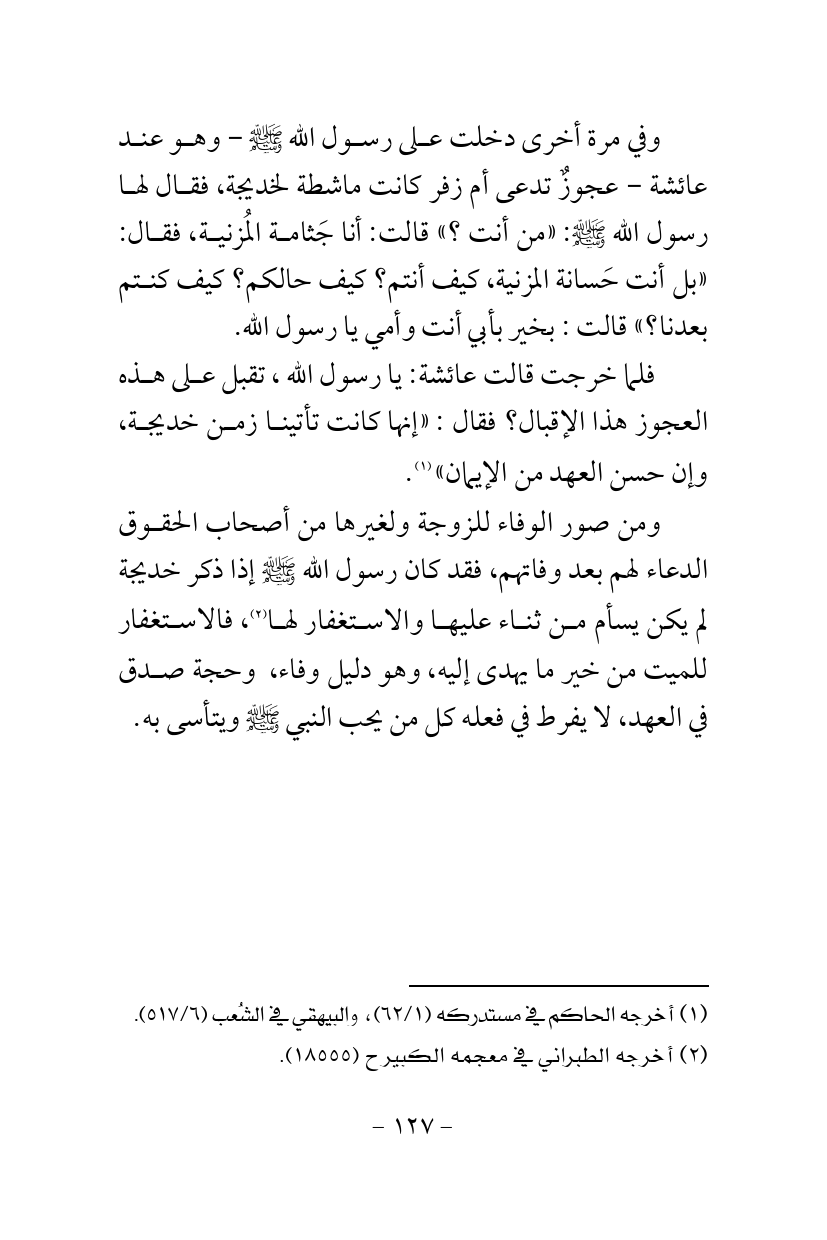فلما خرجت قالت عائشة: يا رسول الله، تقبل على هذه العجوز هذا الإقبال؟ فقال: «إنها كانت تأتينا زمن خديجة، وإن حسن العهد من الإيمان» (¬1).