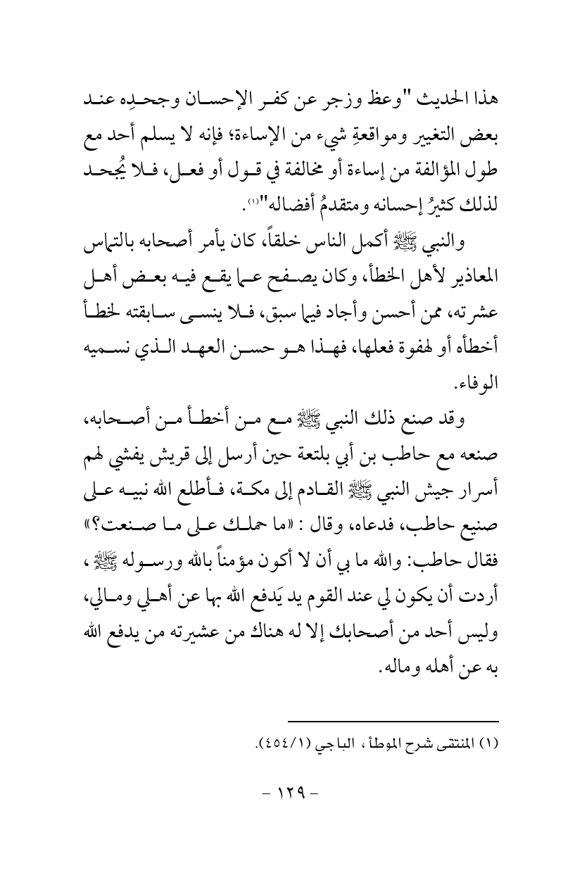 والنبي - صلى الله عليه وسلم - أكمل الناس خلقاً، كان يأمر أصحابه بالتماس المعاذير لأهل الخطأ، وكان يصفح عما يقع فيه بعض أهل عشرته، ممن أحسن وأجاد فيما سبق، فلا ينسى سابقته لخطأ أخطأه أو لهفوة فعلها، فهذا هو حسن العهد الذي نسميه الوفاء.