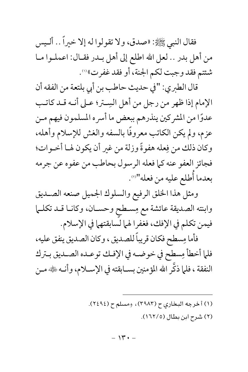 ومثل هذا الخلق الرفيع والسلوك الجميل صنعه الصديق وابنته الصديقة عائشة مع مِسطحٍ وحسان، وكانا قد تكلما فيمن تكلم في الإفك، فغفرا لهما لسابقتهما في الإسلام.