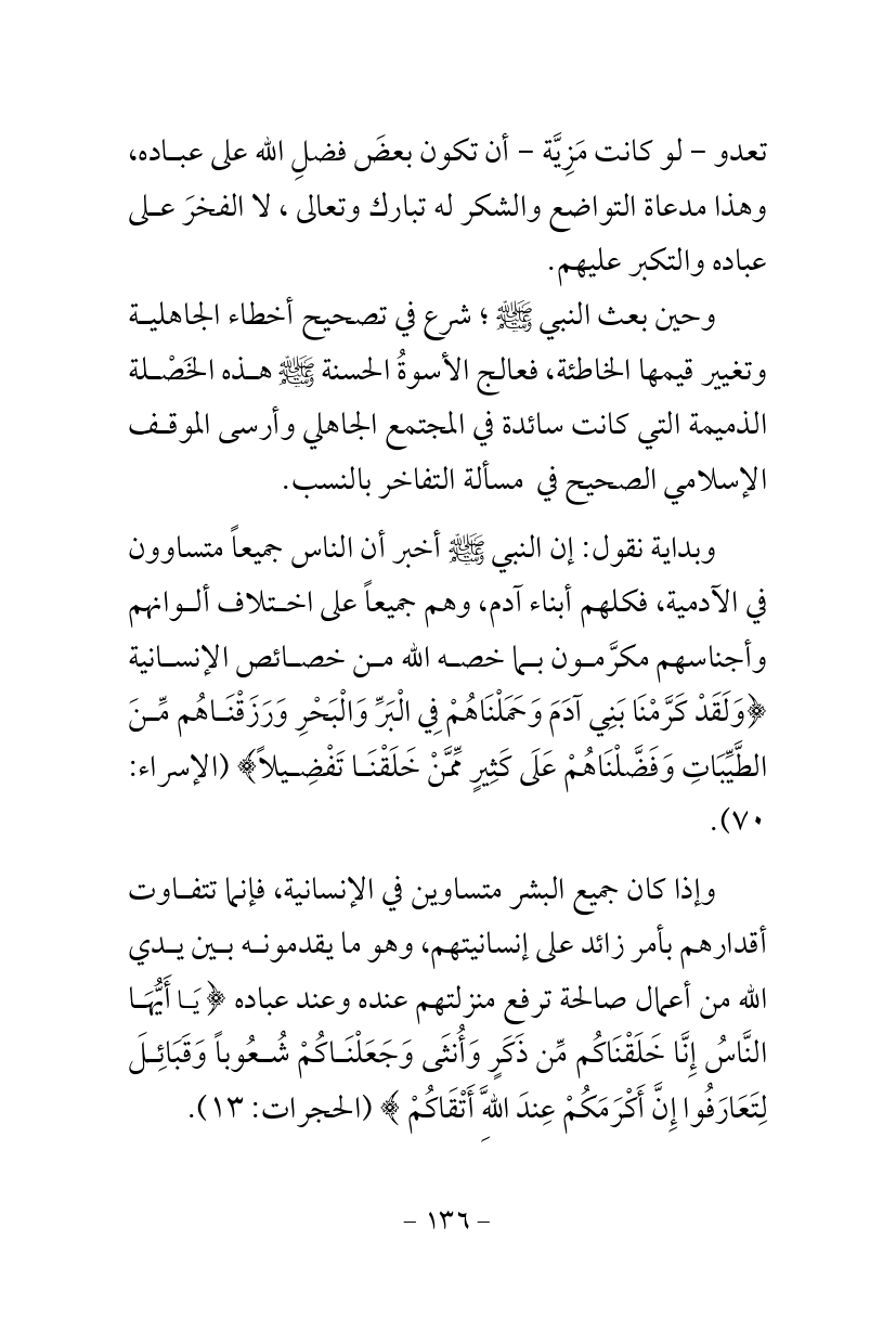 وبداية نقول: إن النبي - صلى الله عليه وسلم - أخبر أن الناس جميعاً متساوون في الآدمية، فكلهم أبناء آدم، وهم جميعاً على اختلاف ألوانهم وأجناسهم مكرَّمون بما خصه الله من خصائص الإنسانية {وَلَقَدْ كَرَّمْنَا بَنِي آدَمَ وَحَمَلْنَاهُمْ فِي الْبَرِّ وَالْبَحْرِ وَرَزَقْنَاهُم مِّنَ الطَّيِّبَاتِ وَفَضَّلْنَاهُمْ عَلَى كَثِيرٍ مِّمَّنْ خَلَقْنَا تَفْضِيلاً} (الإسراء: 70).