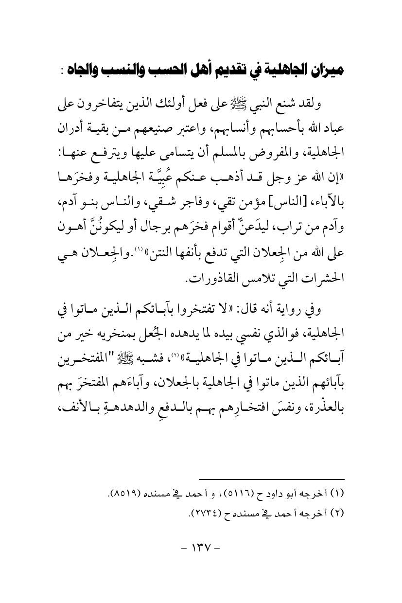 ولقد شنع النبي - صلى الله عليه وسلم - على فعل أولئك الذين يتفاخرون على عباد الله بأحسابهم وأنسابهم، واعتبر صنيعهم من بقية أدران الجاهلية، والمفروض بالمسلم أن يتسامى عليها ويترفع عنها: «إن الله عز وجل قد أذهب عنكم عُبِيَّة الجاهلية وفخرَها بالآباء، [الناس] مؤمن تقي، وفاجر شقي، والناس بنو آدم، وآدم من تراب، ليدَعنَّّ أقوام فخرَهم برجال أو ليكونُنَّ أهون على الله من الجِعلان التي تدفع بأنفها النتن» (¬1).والجِعلان هي الحشرات التي تلامس القاذورات.
