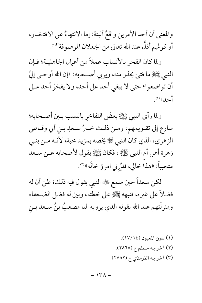 ولما رأى النبي - صلى الله عليه وسلم - بعضَ التفاخرِ بالنسب بين أصحابه؛ سارع إلى تقويمهم، ومن ذلك خبرُ سعدِ بنِ أبي وقاص الزهري، الذي كان النبي - صلى الله عليه وسلم - يخصه بمزيد محبة، لأنه من بني زهرة أهل أمِِ النبي - صلى الله عليه وسلم -، فكان - صلى الله عليه وسلم - يقول لأصحابه عن سعد متحبباً: «هذا خالي، فليُرِني امرؤ خالَه» (¬3).