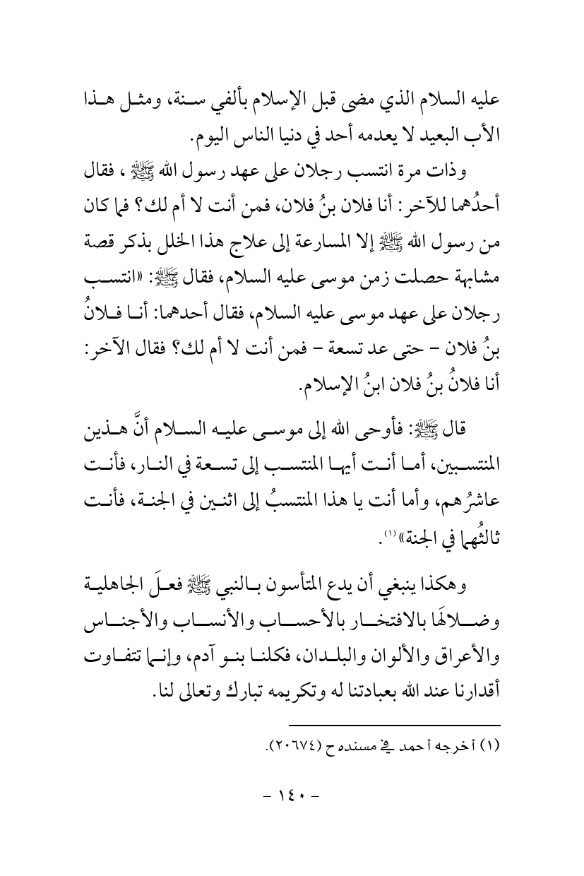 وذات مرة انتسب رجلان على عهد رسول الله - صلى الله عليه وسلم -، فقال أحدُهما للآخر: أنا فلان بنُ فلان، فمن أنت لا أم لك؟ فما كان من رسول الله - صلى الله عليه وسلم - إلا المسارعة إلى علاج هذا الخلل بذكر قصة مشابهة حصلت زمن موسى عليه السلام، فقال - صلى الله عليه وسلم -: «انتسب رجلان على عهد موسى عليه السلام، فقال أحدهما: أنا فلانُ بنُ فلان - حتى عد تسعة - فمن أنت لا أم لك؟ فقال الآخر: أنا فلانُ بنُ فلان ابنُ الإسلام.