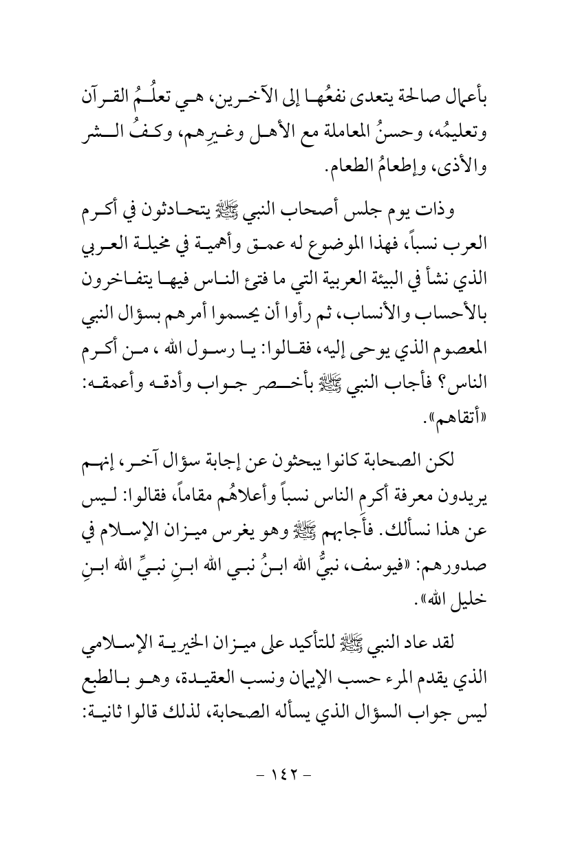 لكن الصحابة كانوا يبحثون عن إجابة سؤال آخر، إنهم يريدون معرفة أكرمِ الناس نسباً وأعلاهُم مقاماً، فقالوا: ليس عن هذا نسألك. فأجابهم - صلى الله عليه وسلم - وهو يغرس ميزان الإسلام في صدورهم: «فيوسف، نبيُّ الله ابنُ نبي الله ابنِ نبيِّ الله ابنِ خليل الله».