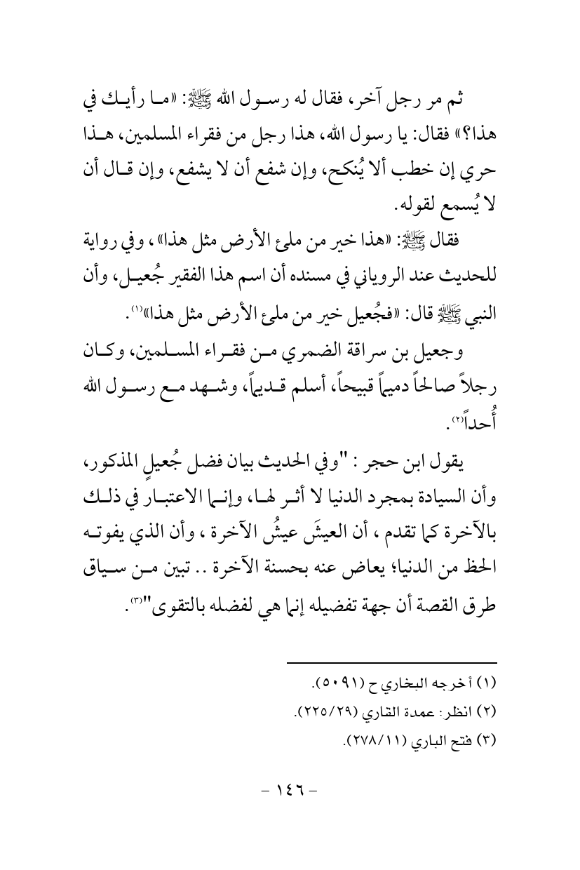 فقال - صلى الله عليه وسلم -: «هذا خير من ملئ الأرض مثل هذا»، وفي رواية للحديث عند الروياني في مسنده أن اسم هذا الفقير جُعيل، وأن النبي - صلى الله عليه وسلم - قال: «فجُعيل خير من ملئ الأرض مثل هذا» (¬1).