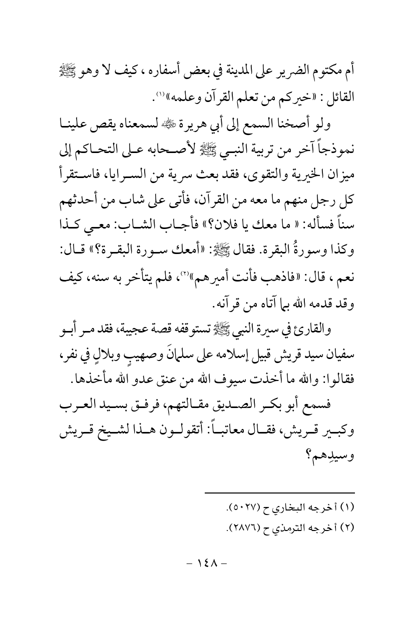 ولو أصخنا السمع إلى أبي هريرة - رضي الله عنه - لسمعناه يقص علينا نموذجاً آخر من تربية النبي - صلى الله عليه وسلم - لأصحابه على التحاكم إلى ميزان الخيرية والتقوى، فقد بعث سرية من السرايا، فاستقرأ كل رجل منهم ما معه من القرآن، فأتى على شاب من أحدثهم سناً فسأله: «ما معك يا فلان؟» فأجاب الشاب: معي كذا وكذا وسورةُ البقرة. فقال - صلى الله عليه وسلم -: «أمعك سورة البقرة؟» قال: نعم، قال: «فاذهب فأنت أميرهم» (¬2)، فلم يتأخر به سنه، كيف وقد قدمه الله بما آتاه من قرآنه.