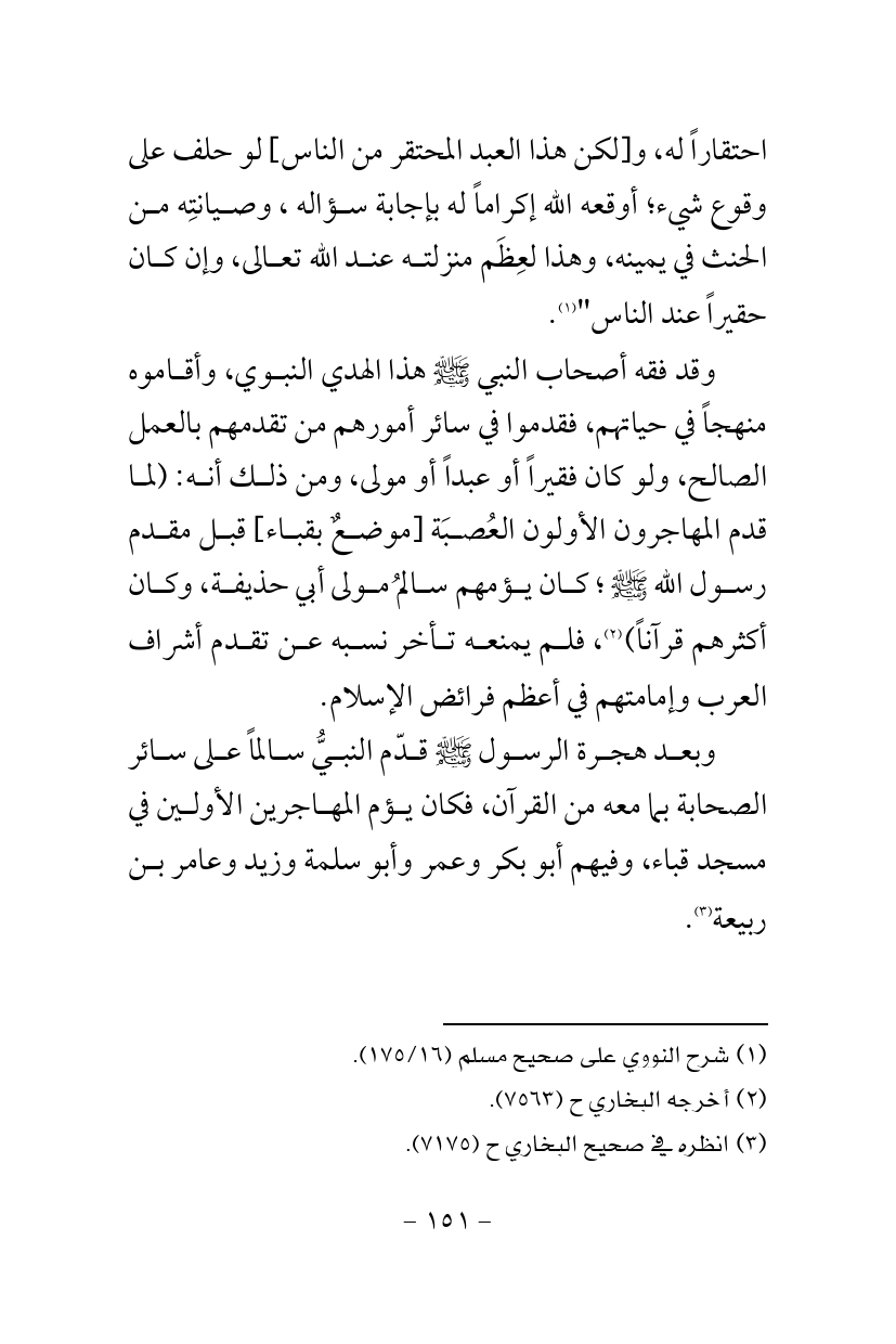 وقد فقه أصحاب النبي - صلى الله عليه وسلم - هذا الهدي النبوي، وأقاموه منهجاً في حياتهم، فقدموا في سائر أمورهم من تقدمهم بالعمل الصالح، ولو كان فقيراً أو عبداً أو مولى، ومن ذلك أنه: (لما قدم المهاجرون الأولون العُصبَة [موضعٌ بقباء] قبل مقدم رسول الله - صلى الله عليه وسلم -؛ كان يؤمهم سالمُ مولى أبي حذيفة، وكان أكثرهم قرآناً) (¬2)، فلم يمنعه تأخر نسبه عن تقدم أشراف العرب وإمامتهم في أعظم فرائض الإسلام.